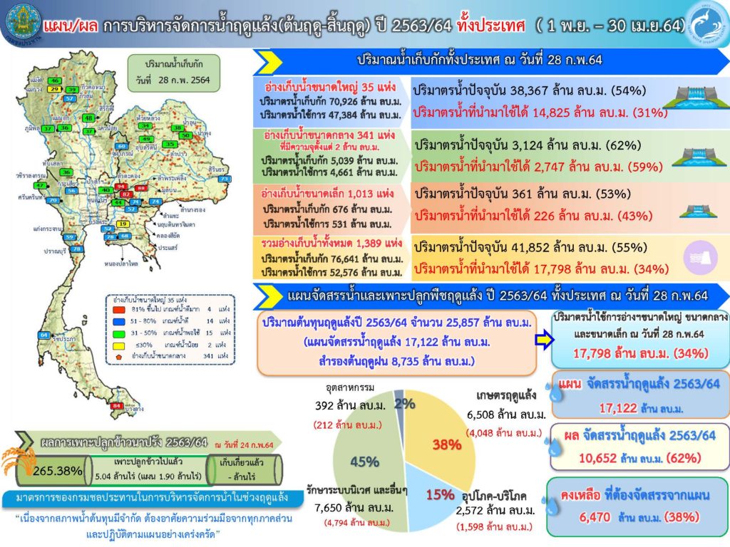 ดร.ทวีศักดิ์ ธนเดโชพล รองอธิบดีกรมชลประทาน เปิดเผยหลังการประชุมคณะอนุกรรมการติดตามและวิเคราะห์แนวโน้มสถานการณ์น้ำ ร่วมกับหน่วยงานที่เกี่ยวข้องว่า ปัจจุบัน (1 มี.ค. 64) อ่างเก็บน้ำขนาดใหญ่และขนาดกลางทั่วประเทศ มีปริมาณน้ำรวมกันประมาณ 41,542 ล้าน ลบ.ม. คิดเป็นร้อยละ 55 ของความจุอ่างฯรวมกัน มีปริมาณน้ำใช้การได้รวมกันประมาณ 17,612 ล้าน ลบ.ม. จนถึงขณะนี้มีการใช้น้ำไปแล้ว 10,652 ล้าน ลบ.ม. คิดเป็นร้อยละ 62 ของแผนฯ เฉพาะ 4 เขื่อนหลักลุ่มน้ำเจ้าพระยา (เขื่อนภูมิพล เขื่อนสิริกิติ์ เขื่อนแควน้อยบำรุงแดน และเขื่อนป่าสักชลสิทธิ์) มีปริมาณน้ำรวมกันประมาณ 10,262 ล้าน ลบ.ม. หรือร้อยละ 41 ของความจุอ่างฯรวมกัน ปริมาณน้ำใช้การได้ประมาณ 3,566 ล้าน ลบ.ม. มีการใช้น้ำไปแล้ว 3,091 ล้าน ลบ.ม. คิดเป็นร้อยละ 77 ของแผนฯ