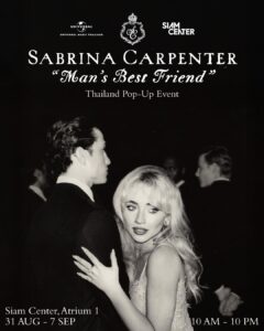 ใครที่พลาดโอกาสในการร่วมอีเวนต์ในครั้งนี้ไม่ต้องเสียใจไป เพราะ Sabrina Carpenter – Man’s Best Friend Thailand Pop-Up Event ป็อปอัปอีเวนต์สุดพิเศษนี้จะยังจัดอย่างต่อเนื่อง ที่สยามเซ็นเตอร์ โซน Atrium 1 ตั้งแต่วันนี้ – 7 กันยายน แฟน ๆ สามารถรับโปสเตอร์ Man’s Best Friend สุดสวย(จำนวนจำกัด) ถ่ายรูปกับแบ็กดร็อปสุดอลังการ โต๊ะ เก้าอี้ และการตกแต่งสวย ๆในธีมอัลบั้ม Man’s Best Friend โฟโต้บูธที่มาพร้อมเฟรมสุด Exclusive เฉพาะงานนี้เท่านั้น รวมถึงยังคงได้เอร็ดอร่อยกับเมนูสุดพิเศษจาก 3 แบรนด์ดังของเราเช่นเคย นอกจากนี้ยังมีกิจกรรม “Your Favorite Man’s Best Friend” ฟังอัลบั้ม Man’s Best Friend แล้ว มาเลือกแทร็กโปรดของคุณกันได้ที่งานนี้อีกด้วยจัดเต็มให้ขนาดนี้แล้ว บอกเลยว่าถ้าเป็นแฟนของ Sabrina Carpenter ตัวจริงห้ามพลาดเด็ดขาด