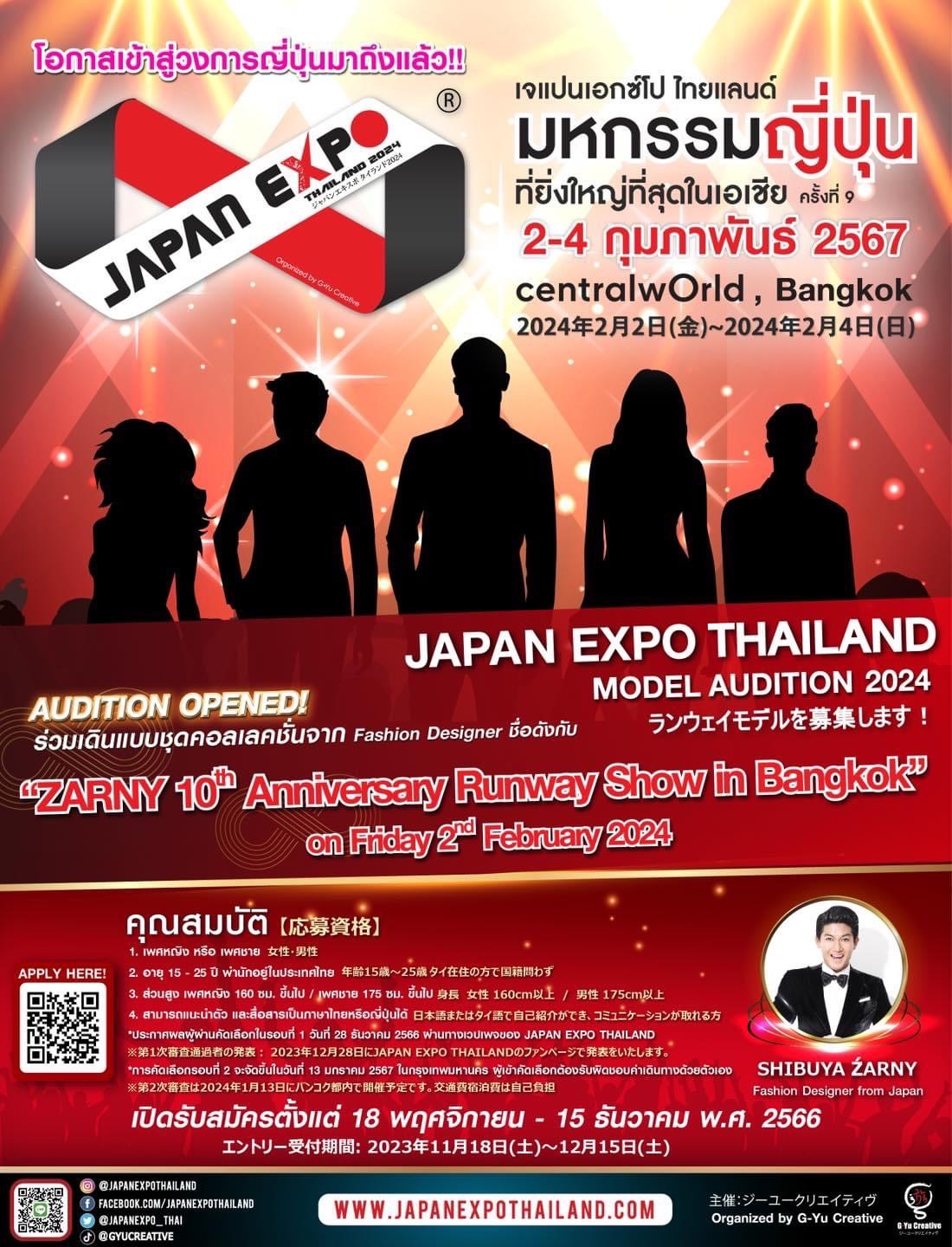 JAPAN EXPO THAILAND 2024 ครั้งที่ 9 งานมหกรรมญี่ปุ่นที่ยิ่งใหญ่ที่สุดในเอเชีย จัดโดย บริษัท จี-ยู ครีเอทีฟ จำกัด พร้อมด้วยเหล่าพันธมิตรทั้งภาครัฐและเอกชน ผนึกกำลังจัดงานอีเว้นท์ญี่ปุ่นที่ใหญ่ที่สุดในเอเชีย โดยในปีนี้ชูคอนเซ็ปท์ JOURNEY TO JAPAN มหกรรม SOFT POWER แห่งชาติ รวมพลังไทย-ญี่ปุ่น กระตุ้นเศรษฐกิจแห่งปี!!! โดยจะจัดขึ้นระหว่างวันศุกร์ที่ 2 – วันอาทิตย์ที่ 4 กุมภาพันธ์ 2567 ตั้งแต่ 10.00-21.00 น. ณ ศูนย์การค้าเซ็นทรัลเวิลด์