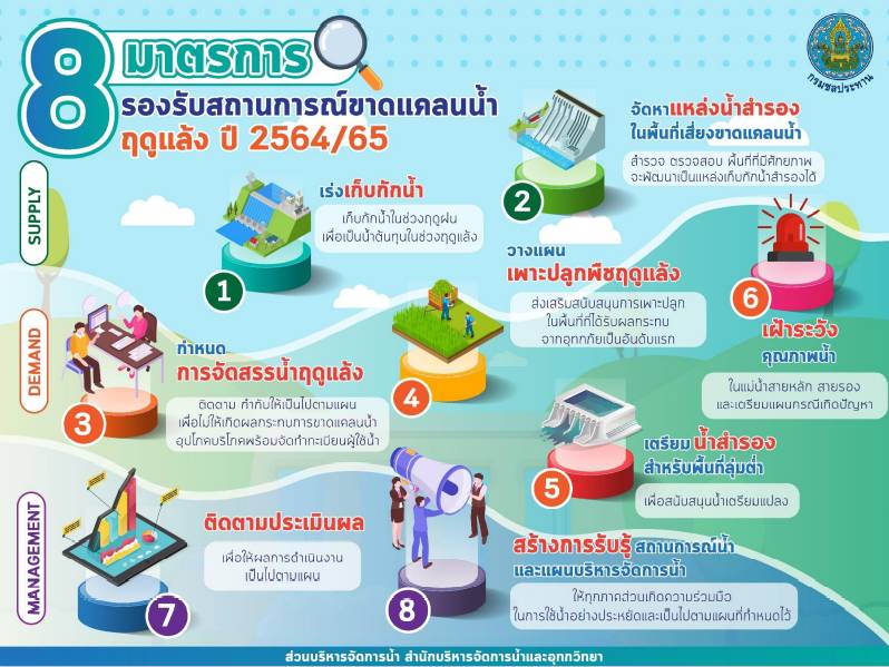 นายประพิศ จันทร์มา อธิบดีกรมชลประทาน เปิดเผยว่า ปัจจุบันพื้นที่ทางตอนบนของประเทศไทยได้สิ้นสุดฤดูฝนแล้ว ยกเว้นภาคใต้ กรมชลประทาน ได้วางแผนจัดสรรน้ำฤดูแล้งปี 2564/65(1 พ.ย. 64 – 30 เม.ย. 65) เพื่อสนับสนุนการใช้น้ำในเขตพื้นที่ชลประทานทั้งประเทศ โดย ณ วันที่ 1 พฤศจิกายน 2564 ซึ่งเป็นวันเริ่มจัดสรรน้ำฤดูแล้ง มีปริมาณน้ำต้นทุนทั้งประเทศรวมกันประมาณ 37,857 ล้านลูกบาศก์เมตร(ลบ.ม.) กรมชลประทาน ได้วางแผนจัดสรรน้ำฤดูแล้งทั้งสิ้น 22,280 ล้าน ลบ.ม. หรือร้อยละ 59 ของปริมาณน้ำต้นทุนทั้งหมด สำหรับใช้ในการอุปโภคบริโภค รักษาระบบนิเวศ อุตสาหกรรม และการเกษตร ปริมาณน้ำที่เหลืออีก 15,577 ล้าน ลบ.ม. จะสำรองไว้ใช้ในช่วงต้นฤดูฝนปี 65