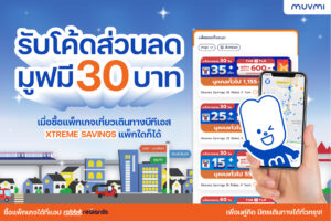 • รับทันทีคูปองที่มาพร้อมโค้ดส่วนลด 30 บาท สำหรับใช้บนแอปพลิเคชัน MuvMi เมื่อซื้อแพ็กเกจ XTREME SAVINGS บนแอปพลิเคชัน Rabbit Rewards