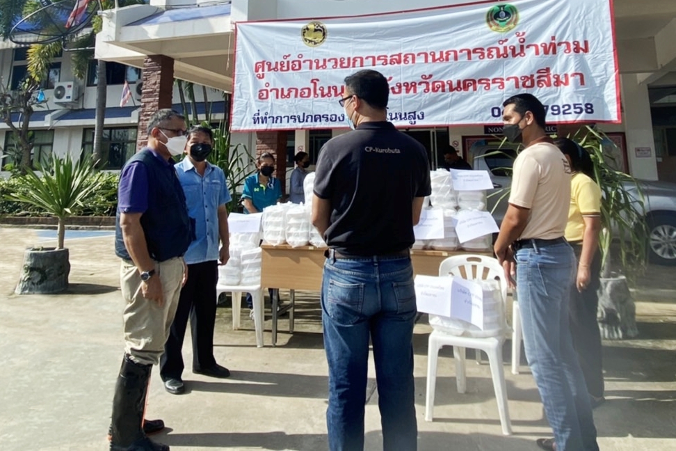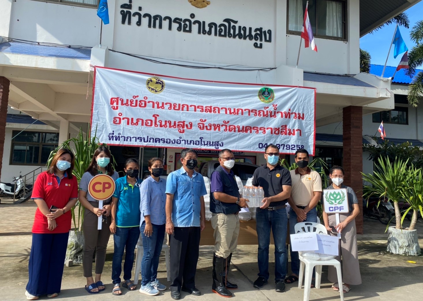 ทางด้าน ศูนย์อำนวยการสถานการณ์น้ำท่วม อำเภอโนนสูง จังหวัดนครราชสีมา ณ ที่ว่าการอำเภอโนนสูง พันจ่าโททวี พิมพ์อุบล นายอำเภอโนนสูง และนายพินิจ จตุรโกมล ปศุสัตว์อำเภอโนนสูง รับมอบอาหารปรุงสุกพร้อมรับประทาน และน้ำดื่มซีพี เพื่อนำไปแจกจ่ายให้กับชาวชุมชน ที่ได้รับผลกระทบจากมวลน้ำที่ไหลมาจากอ่างเก็บน้ำลำเชียงไกร เข้าท่วมพื้นที่พักอาศัย และขอขอบคุณการสนับสนุนที่ได้รับจากซีพี-ซีพีเอฟในครั้งนี้ ที่สามารถช่วยคลายความเดือดร้อนด้านอาหารให้กับพี่น้องประชาชนได้ โดยมี นายศุภวิชญ์ โชติมุข ผู้แทนซีพีเอฟ และทีมซีพีเอฟจิตอาสาจากธุรกิจสุกร ร่วมมอบผลิตภัณฑ์