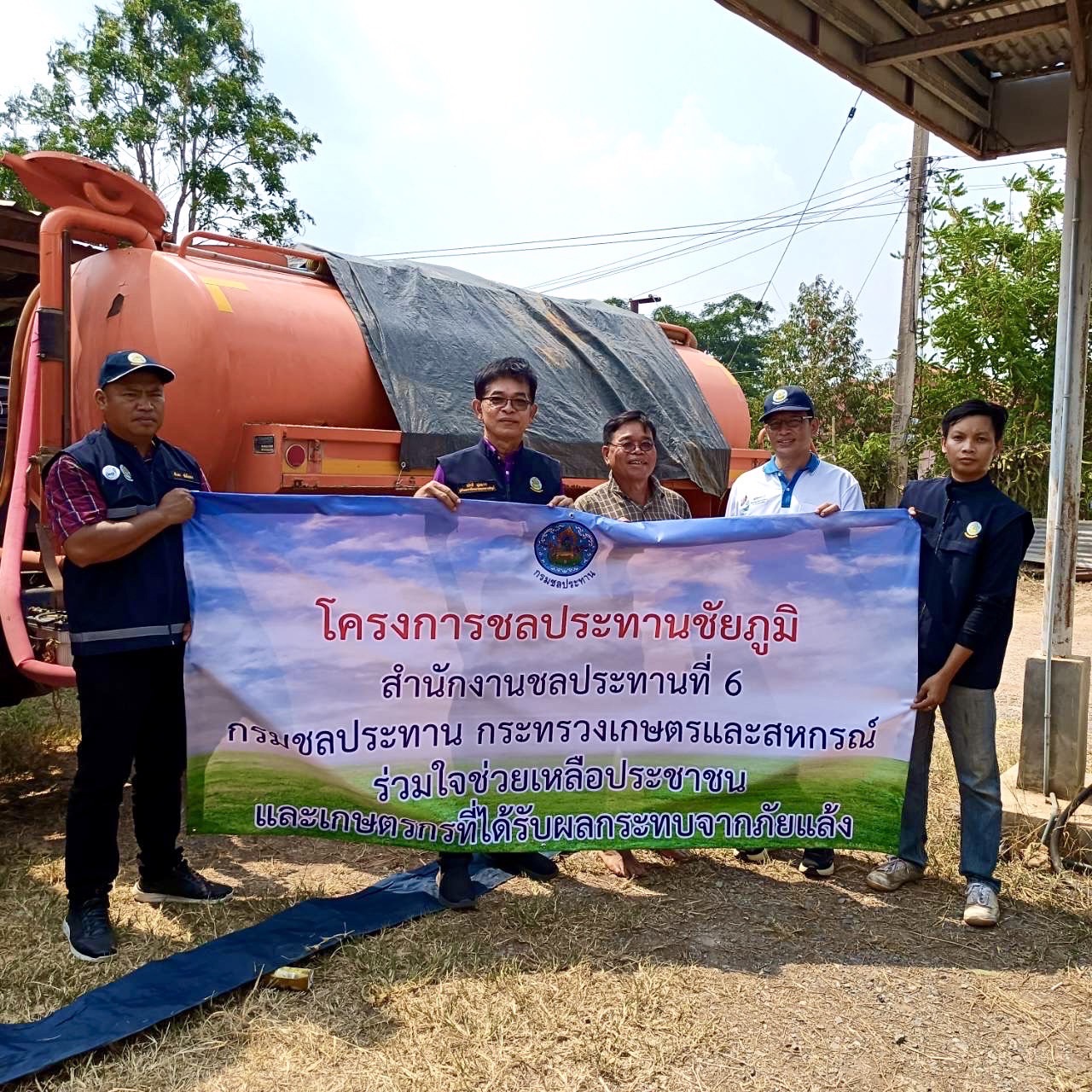 สำนักงานชลประทานที่ 6 นำรถบรรทุกน้ำช่วยเหลือเกษตรกรชาวสวนทุเรียนที่ประสบปัญหาภัยแล้งในเขตพื้นที่ หมู่ 4 บ้านน้ำลาด ตำบลนายางกลัก อำเภอเทพสถิต จังหวัดชัยภูมิ