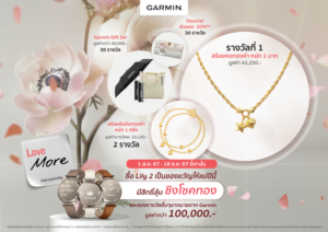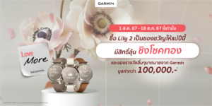 Garmin ต้อนรับเทศกาลวันแม่ผ่านแคมเปญ Love More with Garmin ชวนมอบสุขภาพดีเป็นของขวัญตอบแทนความรักอันยิ่งใหญ่ของคุณแม่ พร้อมเพิ่มความสุขให้มากกว่าเดิม เพียงซื้อ Garmin LILY 2 และ LILY 2 Classic สีใดก็ได้ จากร้านค้าและร้านออนไลน์ที่เป็นตัวแทนจำหน่ายอย่างเป็นทางการของการ์มิน ประเทศไทย ตั้งแต่วันที่ 1 – 18 สิงหาคม 2567 นำใบเสร็จลงทะเบียนผ่านลิงค์ https://www.garmin.com/th-TH/forms/2024-lucky-draw/ รับสิทธิ์ลุ้น รางวัลที่ 1 สร้อยคอทองคำหนัก 1 บาท จำนวน 1 รางวัล รางวัลที่ 2 สร้อยข้อมือทองคำ 1 สลึงจำนวน 2 รางวัล รางวัลที่ 3 ชุดของขวัญ กระบอกน้ำเก็บความเย็นและกระเป๋าผ้า Garmin จำนวน 15 รางวัล รางวัลที่ 4 ชุดของขวัญ ร่มกันฝนและกระเป๋าผ้า Garmin จำนวน 15 รางวัล และรางวัลที่ 5 คูปองส่วนลด 20% แลกซื้อนาฬิกา Garmin ณ ร้านค้าที่เข้าร่วมรายการ4 รวมมูลค่ากว่า 100,000 บาท ติดตามข้อมูลเพิ่มเติมได้ที่ เฟซบุ๊กแฟนเพจ Garmin Thailand อินสตาแกรม Garmin Thailand และตัวแทนจำหน่ายอย่างเป็นทางการของการ์มินทุกสาขา