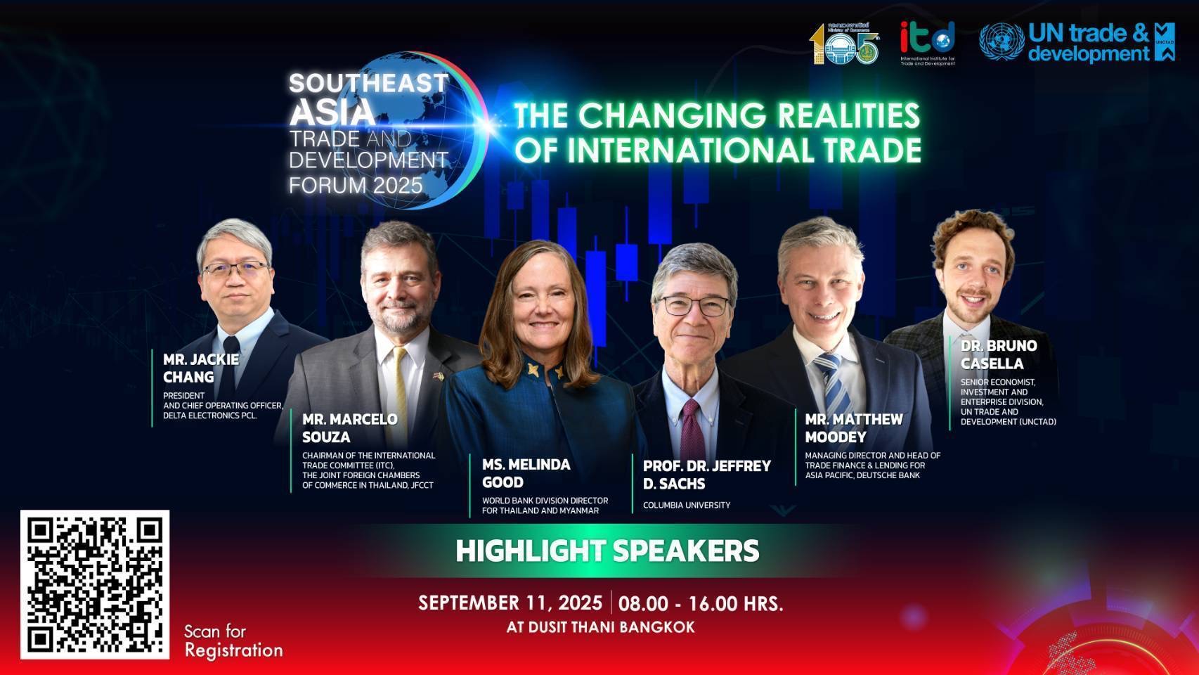 ฟอรัมครั้งนี้ได้รับเกียรติจากกูรูระดับโลกเข้าร่วมอย่างคับคั่ง นำโดย ศาสตราจารย์ Jeffrey D. Sachs นักเศรษฐศาสตร์ชื่อดังระดับโลกจากมหาวิทยาลัย Columbia และอดีตที่ปรึกษาพิเศษของสหประชาชาติ ที่จะมาบรรยายในหัวข้อ “The Global Realities: Trade, Tensions, and Transformation” พร้อมด้วย ดร. Bruno Casella นักเศรษฐศาสตร์อาวุโสจาก UNCTAD ที่จะนำเสนอรายงาน World Investment Report 2025 และ คุณ Melinda Good ผู้อำนวยการธนาคารโลกประจำไทยและเมียนมาร์ ที่จะพูดถึง การจัดหาเงินทุนเพื่ออนาคตการค้าและการพัฒนา
