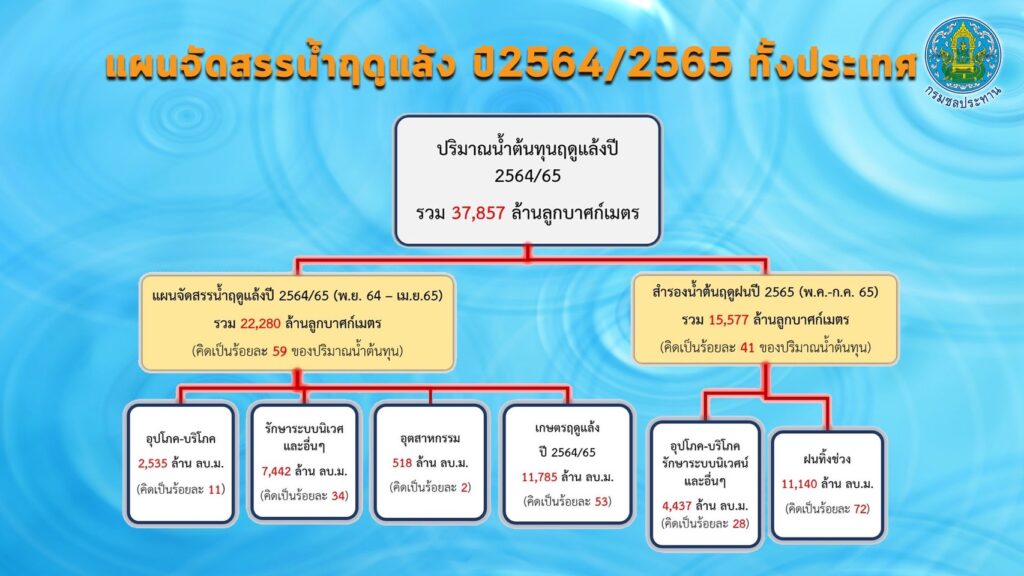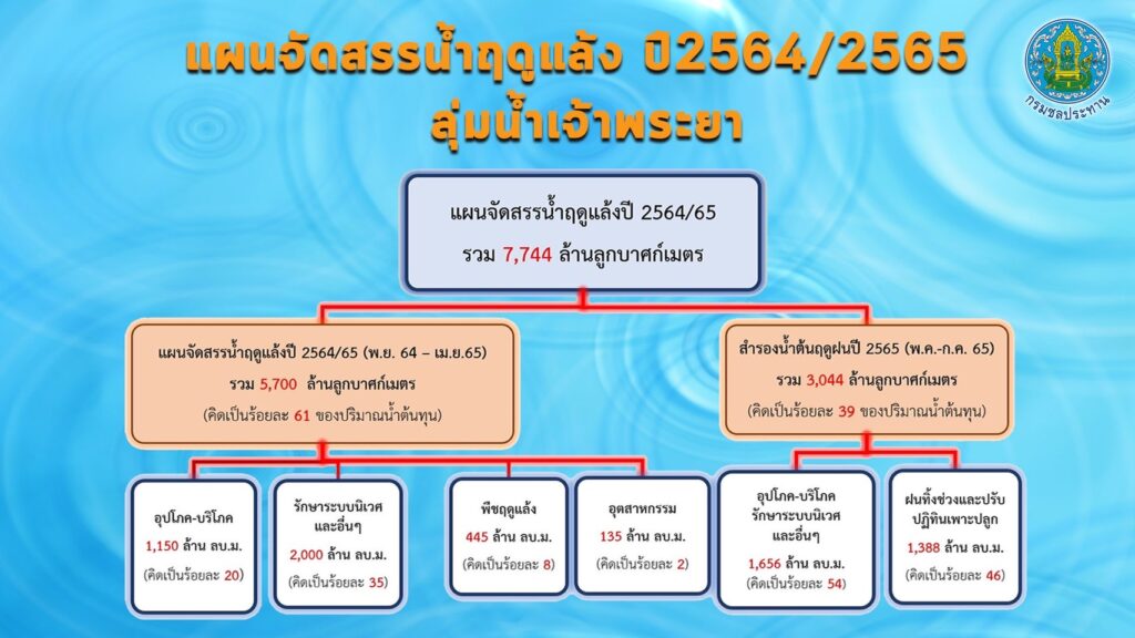 นายประพิศ จันทร์มา อธิบดีกรมชลประทาน เปิดเผยว่า ปัจจุบัน(7 ม.ค. 65) ปริมาณน้ำในอ่างเก็บน้ำขนาดใหญ่และขนาดกลาง มีปริมาณน้ำรวมกันทั้งสิ้น 57,117 ล้าน ลบ.ม. (75% ของความจุอ่างฯรวมกัน) เป็นน้ำใช้การได้ 33,187 ล้าน ลบ.ม. (64% ของความจุอ่างฯรวมกัน) เฉพาะ 4 เขื่อนหลักลุ่มเจ้าพระยา (เขื่อนภูมิพล เขื่อนสิริกิติ์ เขื่อนแควน้อยบำรุงแดน และเขื่อนป่าสักชลสิทธิ์) มีปริมาณน้ำรวมกันทั้งสิ้น 13,858 ล้าน ลบ.ม. (56% ของความจุอ่างฯ รวมกัน) มีปริมาณน้ำใช้การได้ประมาณ 7,162 ล้าน ลบ.ม. (39% ของความจุอ่างฯ รวมกัน) ผลการจัดสรรน้ำฤดูแล้ง(1 พ.ย. 64 – 30 เม.ย. 65) ขณะนี้ทั้งประเทศมีการใช้น้ำไปแล้ว 7,762 ล้าน ลบ.ม. หรือคิดเป็นร้อยละ 35 ของแผนฯ คงเหลือปริมาณน้ำที่ต้องจัดสรรอีก 14,518 ล้าน ลบ.ม. ในส่วนของลุ่มน้ำเจ้าพระยามีการใช้น้ำไปแล้วประมาณ 1,864 ล้าน ลบ.ม. หรือคิดเป็นร้อยละ 33 ของแผนฯ คงเหลือปริมาณน้ำที่ต้องจัดสรรอีก 3,836 ล้าน ลบ.ม. ทั้งนี้ ได้วางแผนจัดสรรน้ำให้สอดคล้องกับปริมาณน้ำต้นทุนในแต่ละพื้นที่ พร้อมจัดลำดับความสำคัญของกิจกรรม โดยจัดสรรน้ำเพื่อการอุปโภคบริโภคในช่วงฤดูแล้ง เป็นอันดับแรก และน้ำเพื่อการรักษาระบบนิเวศ ตามลำดับ ส่วนหนึ่งจะสำรองไว้ใช้ในช่วงต้นฤดูฝนเดือนพฤษภาคม-กรกฎาคม 2565 ด้านการเกษตรกรรมได้จัดสรรน้ำตามปริมาณน้ำต้นทุนที่มีอยู่ในแต่ละพื้นที่อย่างเหมาะสม
