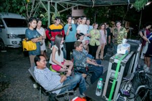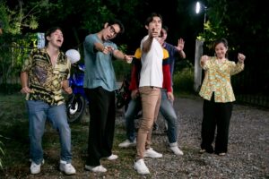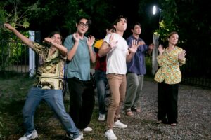 แต่พอผู้กำกับฯ สั่งคัท และบอกว่า “ผ่าน” นักแสดงบางคนถึงกับนั่งคุกเข่า โดยเฉพาะสาวคนเก่ง ต่าย-สายธาร ที่ดูเหมือนจะหอบกว่าใครเพื่อน แต่ก็แอบบอกว่า “สนุกมากๆ เต้นจนลืมอายุตัวเองเลย” (หัวเราะร่วน)