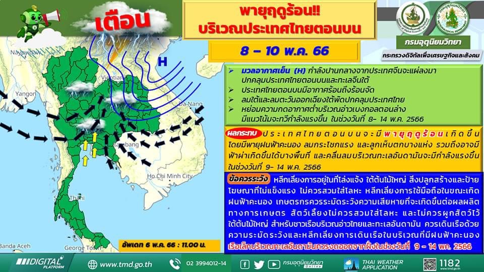 นายประพิศ จันทร์มา อธิบดีกรมชลประทาน เปิดเผยว่า ตามประกาศกรมอุตุนิยมวิทยา ฉบับที่ 2 ลงวันที่ 7 พฤษภาคม 2566 พายุฤดูร้อนบริเวณประเทศไทยตอนบน มีผลกระทบตั้งแต่วันที่ 8 – 10 พฤษภาคม 2566 บริเวณความกดอากาศสูงหรือมวลอากาศเย็นกำลังปานกลางจากประเทศจีนได้แผ่ลงมาปกคลุมประเทศจีนตอนใต้ คาดว่าจะแผ่ลงมาปกคลุมประเทศไทยตอนบนและทะเลจีนใต้ ลักษณะเช่นนี้จะทำให้ประเทศไทยตอนบนมีพายุฤดูร้อนเกิดขึ้น โดยมีลักษณะของพายุฝนฟ้าคะนอง ลมกระโชกแรง และลูกเห็บตกบางแห่ง รวมถึงอาจมีฟ้าผ่าเกิดขึ้นได้บางพื้นที่ นั้น