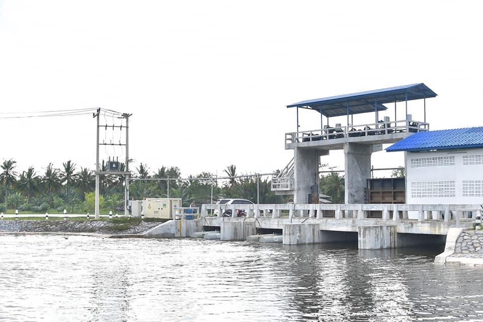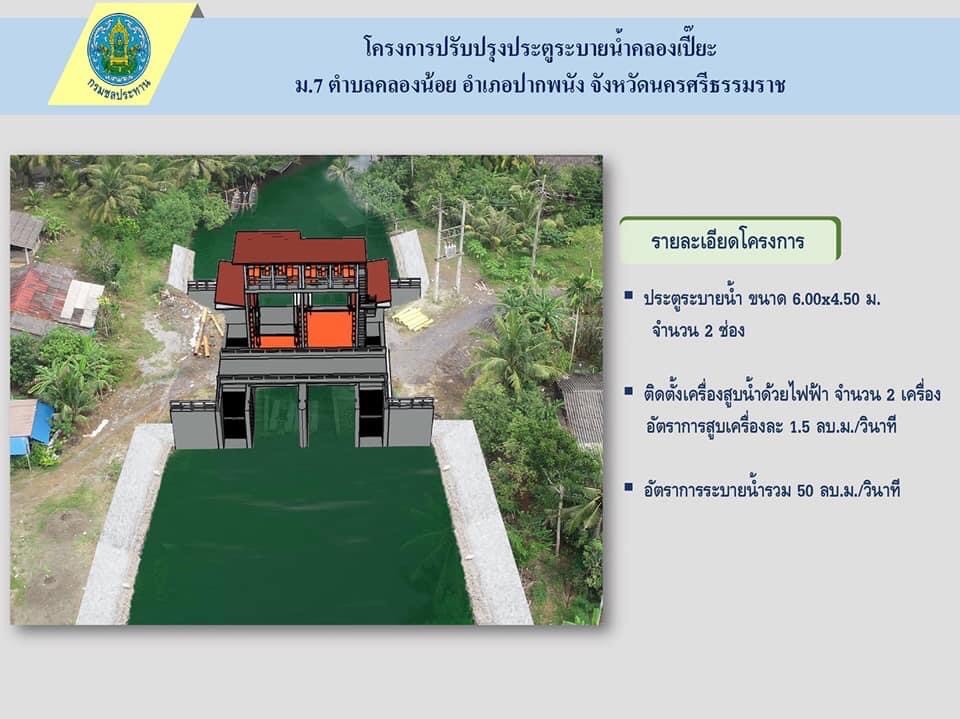นอกจากนี้ กรมชลประทาน ได้ดำเนินการก่อสร้างประตูระบายน้ำบางไทร 2 พร้อมสถานีสูบน้ำด้วยไฟฟ้า อำเภอปากพนัง ปัจจุบันดำเนินการเสร็จแล้ว ซึ่งจะช่วยระบายน้ำออกจากพื้นที่ลุ่มต่ำของตำบลเกาะทวดและตำบลป่าระกำ อำเภอปากพนัง ออกสู่แม่น้ำปากพนังลงสู่ทะเลอ่าวไทยตามลำดับ และพิจารณาปรับปรุงอาคารชลประทาน บริเวณประตูระบายน้ำเปี๊ยะ อำเภอปากพนัง ตามข้อสั่งการของนายกรัฐมนตรี โดยการปรับปรุงขยายประตูระบายน้ำให้สามารถระบายน้ำได้เพิ่มมากขึ้น เพื่อช่วยบรรเทาอุทกภัยในพื้นที่ปลูกส้มโอทับทิมสยาม ก่อนระบายออกสู่ทะเล จากเดิมที่มีประตูระบายน้ำเพียง 1 ช่อง ระบายน้ำได้ในอัตรา 20 ลบ.ม./วินาที ได้ออกแบบใหม่ให้มีประตูระบายน้ำ 2 ช่อง พร้อมสถานีสูบน้ำด้วยไฟฟ้าจำนวน 2 เครื่อง ซึ่งจะทำให้ระบายน้ำเพิ่มได้ในอัตรา 50 ลบ.ม./วินาที ปัจจุบันดำเนินการออกแบบเสร็จแล้ว และจะดำเนินการของบการก่อสร้างในปีงบประมาณ พ.ศ.2566 ต่อไป