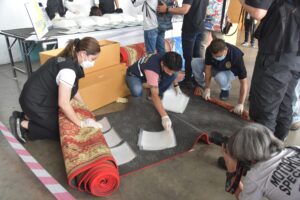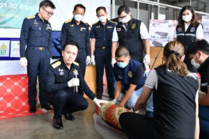 ม้วนอยู่ภายในพรม เตรียมส่งต่างประเทศ น้ำหนักรวมสิ่งห่อหุ้มประมาณ 51 กิโลกรัม มูลค่ากว่า 30 ล้านบาท ณ ศูนย์เอกซเรย์และเทคโนโลยีศุลกากร สำนักงานศุลกากรท่าเรือกรุงเทพ