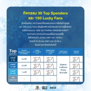 เตรียมพบกับงานแฟนไซน์ครั้งแรกในชีวิตของ “จี๋ สุทธิรักษ์ ทรัพย์วิจิตร” นักแสดงภายใต้สังกัด “Skybox” ในเครือเวิร์คพอยท์กรุ๊ป เจ้าของผลงานสร้างชื่อในบทบาทของ “รก บุรณพนธ์” จากภาพยนตร์ฟอร์มยักษ์เรื่อง “4 KINGS 2” ที่ประสบความสำเร็จอย่างมากไปทั่วประเทศ และ บทบาทของ “ตุลย์” นักแสดงหนุ่มเจ้าเสน่ห์จากละครดังเรื่อง “เกมรักทรยศ” แฟน ๆ ของหนุ่มจี๋ที่อยากใกล้ชิดสุด Exclusive ต้องห้ามพลาดงานนี้! มาร่วมลุ้นเป็น 30 Top Spenders และ 150 Lucky Fans เข้าร่วมกิจกรรมในงาน “GEE SUTTHIRAK FANSIGN EVENT” สัมผัสช่วงเวลาสุดพิเศษกับ “สุดที่รัก”