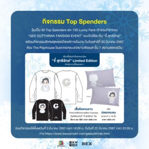 โดยแฟน ๆ สามารถร่วมกิจกรรมได้ตั้งแต่วันนี้ ถึงวันที่ 22 มีนาคม 2567 เวลา 22:00 น. ทาง www.bexconcert.com รับประกันความฟินเพราะได้ผู้จัดคุณภาพอย่าง “BEX” เป็นผู้จัดงาน แล้วพบกันในวันเสาร์ที่ 30 มีนาคม 2567 ณ ห้อง The Playhouse โรงละครเคแบงก์ สยามพิฆเนศ ชั้น 7 สยามสแควร์วัน แล้วมาร่วมเป็น 180 คนในบรรยากาศสุดพิเศษ สร้างโมเมนต์ความทรงจำดี ๆ กับ “จี๋ สุทธิรักษ์” ไปด้วยกัน สามารถติดตามรายละเอียดสินค้า และสิทธิพิเศษต่าง ๆ เพิ่มเติมได้ที่ https://www.bexconcert.com/geesutthirak.html
