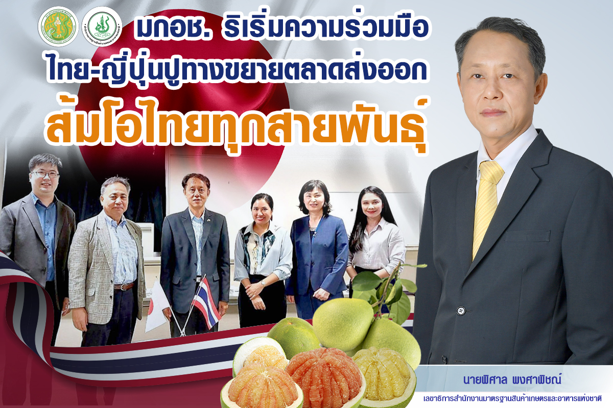เลขาธิการสำนักงานมาตรฐานสินค้าเกษตรและอาหารแห่งชาติ เผยฝ่ายญี่ปุ่นแง้มข่าวดีเตรียมอนุญาตนำเข้าส้มโอไทยทุกสายพันธุ์ จากเดิมอนุญาตเพียงส้มโอทองดี คาดญี่ปุ่นไฟเขียวในปี 2567 พร้อมทั้งถกหน่วยงานญี่ปุ่นสานต่อโครงการความร่วมมือเชิงวิชาการ แลกเปลี่ยนข้อมูลทางวิทยาศาสตร์ ร่วมยกระดับมาตรฐานและดันจุดแข็งสินค้าเกษตร เพิ่มมูลค่าจากการแสดงฉลากสารสำคัญที่มีประโยชน์ต่อสุขภาพบนสินค้าเกษตร