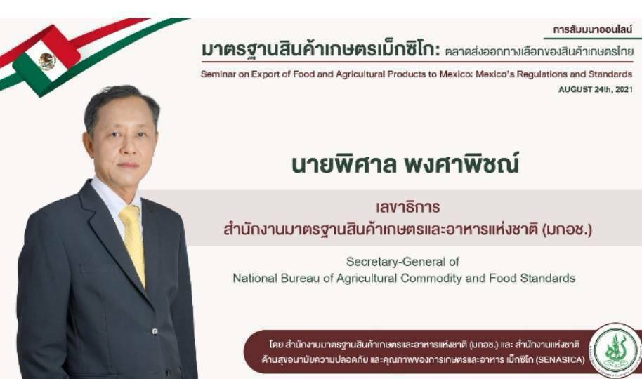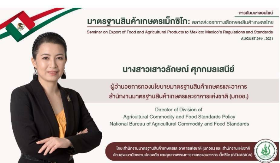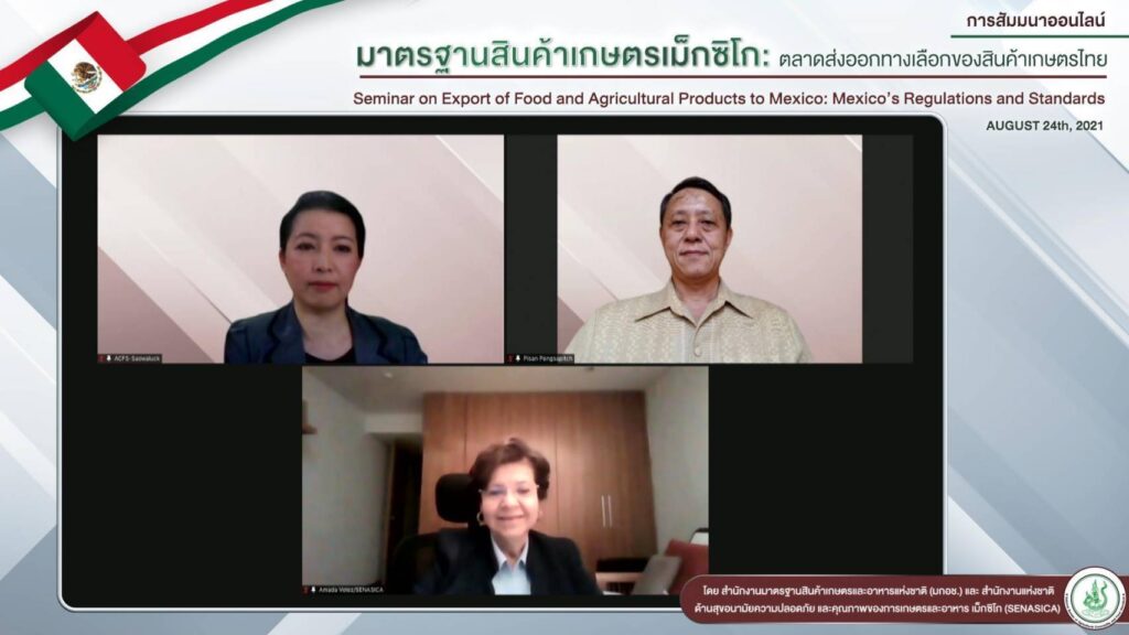 มกอช. ได้ร่วมกับสำนักงานแห่งชาติด้านสุขอนามัยความปลอดภัย และคุณภาพของการเกษตรและอาหาร (Servicio Nacional de Sanidad, Inocuidad y Calidad Agroalimentaria หรือ SENASICA) ของเม็กซิโก จัดการสัมมนา เรื่อง “มาตรฐานสินค้าเกษตรเม็กซิโก: ตลาดส่งออกทางเลือกของสินค้าเกษตรไทย” Seminar on Export of Food and Agricultural Products to Mexico: Mexico’s Regulations and Standards เพื่อให้ผู้เข้าร่วมสัมมนามีความรู้ ความเข้าใจในกฎระเบียบและมาตรฐานที่เกี่ยวข้อง รวมถึงระบบการกำกับดูแลความปลอดภัยสินค้าเกษตรและอาหารนำเข้าของเม็กซิโก สามารถผลิตและส่งออกสินค้าได้สอดคล้อง ตามเงื่อนไขของประเทศคู่ค้า และยังสามารถสอบถามแลกเปลี่ยนความคิดเห็นกับผู้เชี่ยวชาญของ SENASICA ที่เป็นหน่วยงานบังคับใช้กฎระเบียบด้านความปลอดภัยอาหารและตรวจสอบนำเข้าสหรัฐเม็กซิโกได้โดยตรง โดยเป็นการจัดสัมมนาผ่านระบบออนไลน์ 2 ภาษา ไทย-สเปน โดยมีผู้แทนจากหน่วยงานภาครัฐและเอกชน เกษตรกร และสถาบันการศึกษากว่า ๑๕๐ คน เข้าร่วมการสัมมนา