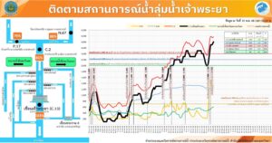 สถานการณ์น้ำลุ่มเจ้าพระยา เมื่อเวลา 06.00 น. ที่สถานีวัดน้ำ P.17 แม่น้ำปิง มีปริมาณไหลผ่าน 1,329 ลบ.ม./วินาที สถานีวัดน้ำ Y.64 แม่น้ำยม มีปริมาณไหลผ่านในอัตรา 501 ลบ.ม./วินาที และสถานีวัดน้ำ N.67 แม่น้ำน่าน มีปริมาณไหลผ่าน 1,225 ลบ.ม./วินาที ก่อนที่จะไหลมารวมกันที่จังหวัดนครสวรรค์ ลงสู่แม่น้ำเจ้าพระยา ที่สถานีวัดน้ำ C.2 อ.เมือง จ.นครสวรรค์ มีปริมาณไหลผ่านในอัตรา 2,965 ลบ.ม./วินาที ในขณะที่สถานี Ct.25 แม่น้ำสะแกกรัง มีปริมาณไหลผ่านในอัตรา 175 ลบ.ม./วินาที ก่อนที่จะไหลไปสมทบกับแม่น้ำเจ้าพระยา บริเวณเหนือเขื่อนเจ้าพระยา จ.ชัยนาท ระดับน้ำหน้าเขื่อนเจ้าพระยา ยกตัวสูงขึ้นในระดับ +17.70 ม.รทก. แนวโน้มสูงขึ้น