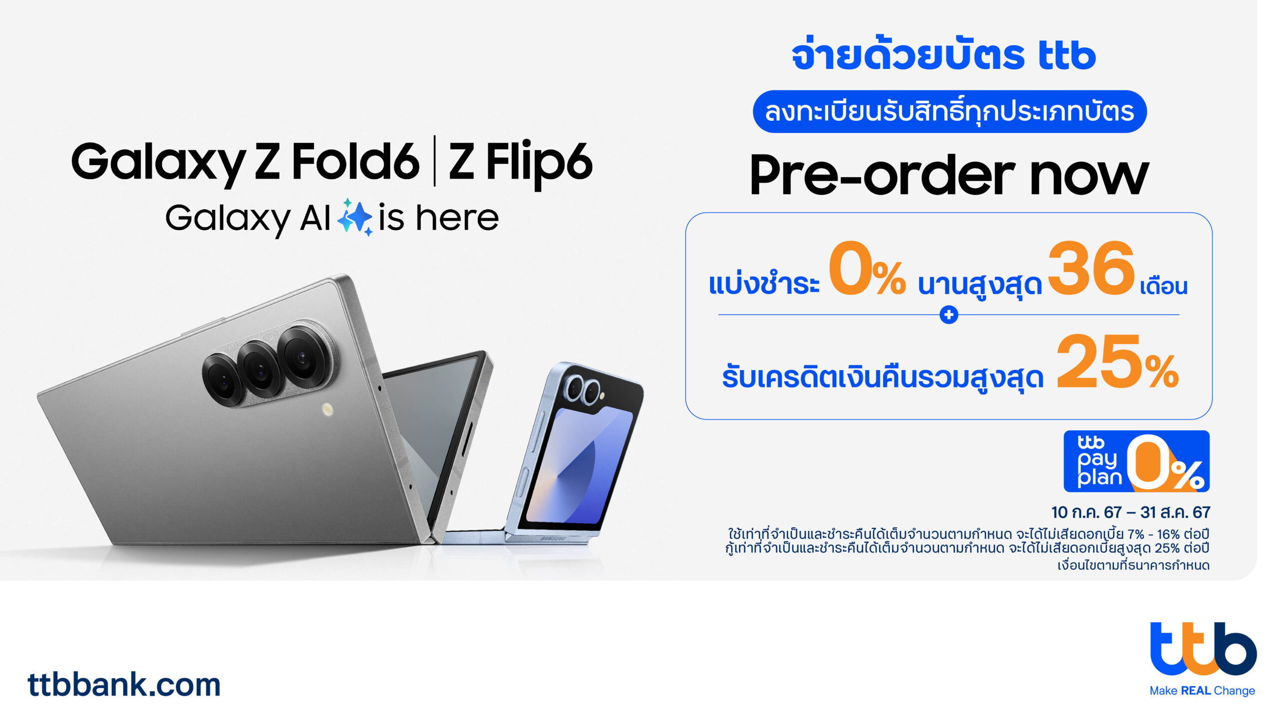 ทีเอ็มบีธนชาต หรือ ทีทีบี มอบสิทธิพิเศษสำหรับผู้ถือบัตรเครดิต ttb บัตรเครดิต ttb Global House และบัตรกดเงินสด ttb เมื่อซื้อ Samsung Galaxy Z Fold6 | Z Flip6 ทุกรุ่นที่ร่วมรายการ สำหรับรายการแบ่งชำระ 0% pay plan นานสูงสุด 36 เดือน กับร้านค้าที่ร่วมรายการทั้งช่องทางสาขา และช่องทางออนไลน์ผ่านทางเว็บไซต์