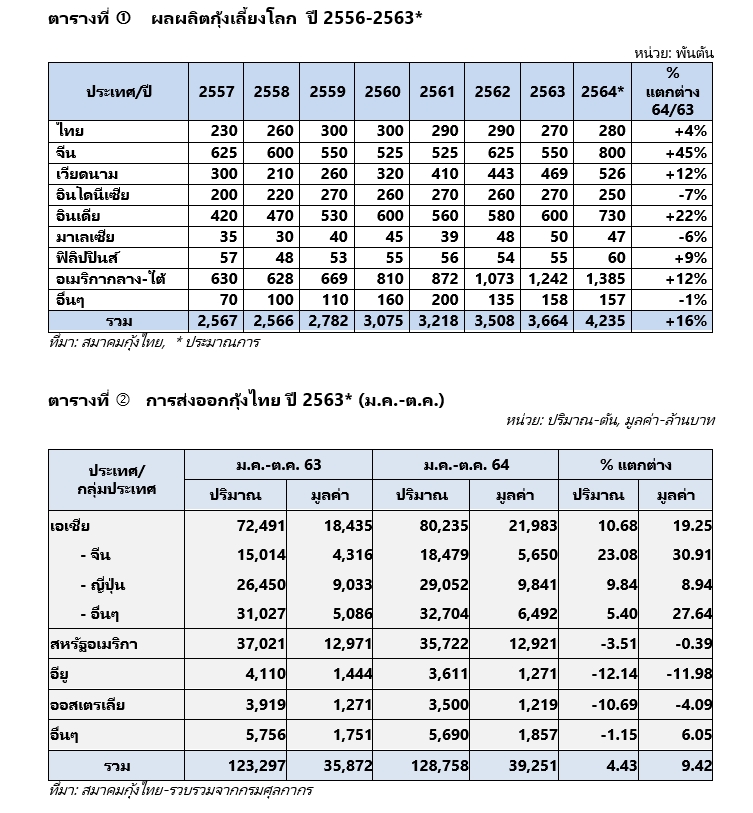 “การผลิตกุ้งของไทยปีนี้ (ปี 2564) คาดจะผลิตได้ 280,000 ตัน เพิ่มขึ้นจากปีที่แล้วเล็กน้อย เป็นผลผลิตกุ้งจากภาคใต้ตอนล่าง ร้อยละ 33 จากภาคใต้ตอนบน ร้อยละ 32 จากภาคตะวันออก ร้อยละ 24 และ จากภาคกลาง ร้อยละ 11 ส่วนผลผลิตกุ้งทั่วโลกคาดว่าจะอยู่ที่ประมาณ 4.24 ล้านตัน เพิ่มขึ้นร้อยละ 16 ดังแสดงในตารางที่ 1 ส่วนการส่งออกกุ้งเดือน ม.ค. – ต.ค. ปีนี้ ปริมาณ 128,758 ตัน มูลค่า 39,251 ล้านบาท เมื่อเทียบกับช่วงเวลาเดียวกันของปี 2563 ที่ส่งออกปริมาณ 123,297 ตัน มูลค่า 35,872 ล้านบาท เพิ่มขึ้นทั้งปริมาณ และมูลค่า ที่ร้อยละ 4 และ ร้อยละ 9 ตามลำดับ ” (ดังแสดงในตารางที่ 2) แม้ประสบปัญหาตู้คอนเทนเนอร์ขาดแคลน ค่าขนส่งราคาสูง และอื่นๆ” นายกสมาคมกุ้งไทย กล่าว