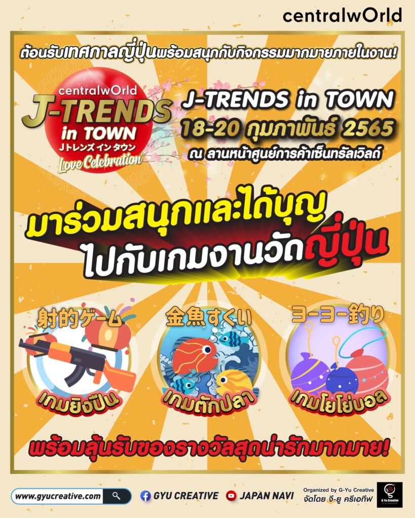 บริษัท จี-ยู ครีเอทีฟ จำกัด ร่วมกับศูนย์การค้าเซ็นทรัลเวิลด์ ชวนเหล่าสาวก Japan lover สนุกกับงานแห่งทศวรรษที่จัดกันมาอย่างยาวนาน พร้อมเปิดเวทีให้เหล่าน้องๆวัยรุ่นได้มาแสดงออกกำลังจะกลับมาอีกครั้ง เตรียมสัมผัสบรรยากาศญี่ปุ่นภายในงาน J-Trends in Town ที่จะร่วมเนรมิตลานหน้าศูนย์การค้าเซ็นทรัลเวิลด์ให้เป็นเทศกาลที่รวมความเป็นญี่ปุ่นต้อนรับเดือนแห่งความรัก