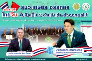 นายอรรถกร ศิริลัทธยากร รัฐมนตรีว่าการกระทรวงเกษตรและสหกรณ์ เปิดเผยว่า ไทยและสาธารณรัฐประชาชนจีนได้เห็นชอบร่วมกันในการปรับปรุงภาคผนวกของ พิธีสารว่าด้วยข้อกำหนดการกักกันโรคและตรวจสอบสำหรับการขนส่งผลไม้ผ่านประเทศที่สาม โดยเพิ่มด่านนำเข้า–ส่งออกผลไม้ของทั้งสองประเทศ เพื่อยกระดับความคล่องตัวด้านการขนส่งสินค้าเกษตรและขยายโอกาสทางการตลาด ที่ผ่านมา กระทรวงเกษตรและสหกรณ์ ได้มอบหมายให้สำนักงานมาตรฐานสินค้าเกษตรและอาหารแห่งชาติ