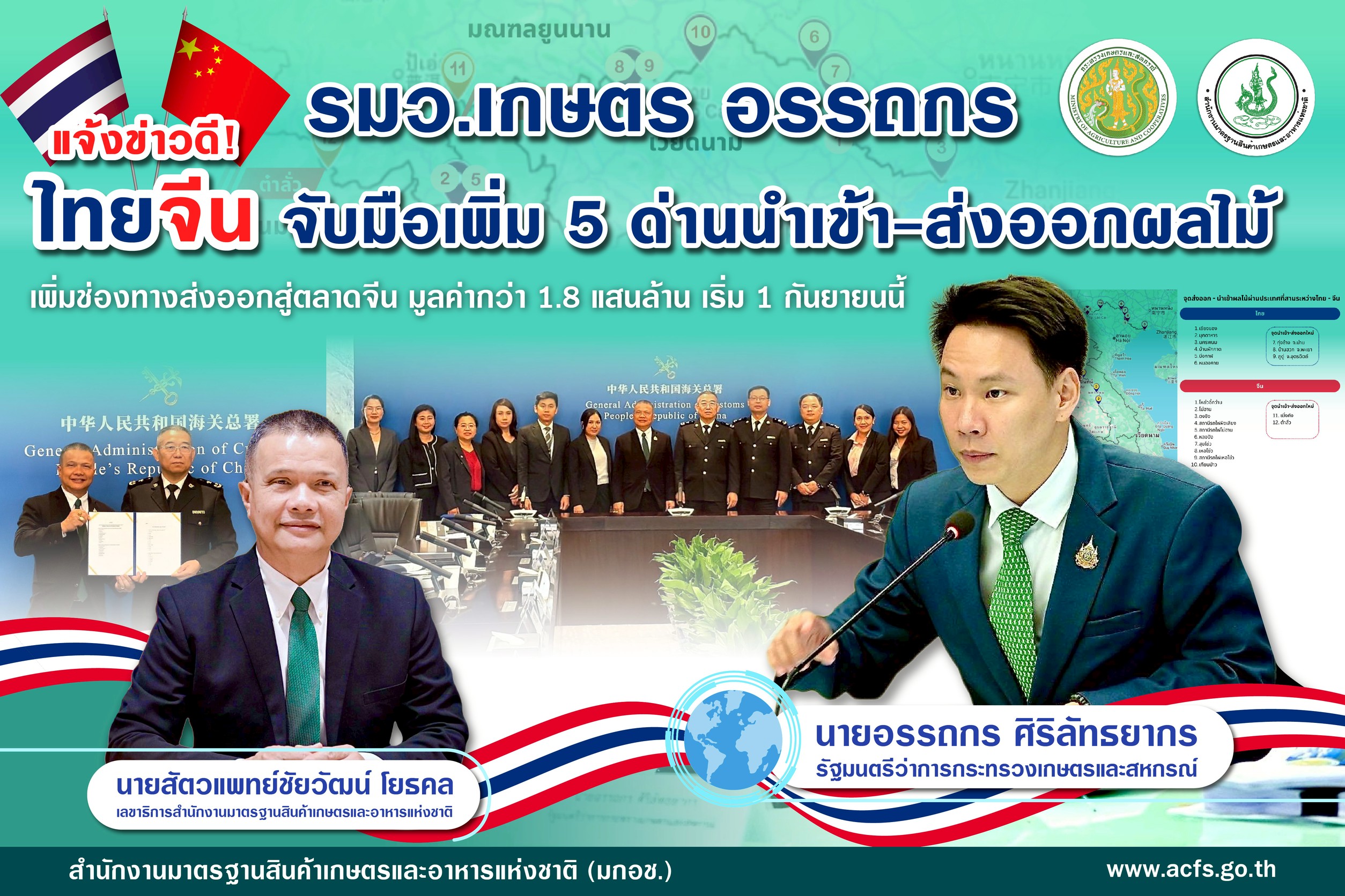 นายชัยวัฒน์ โยธคล เลขาธิการสำนักงานมาตรฐานสินค้าเกษตรและอาหารแห่งชาติ (มกอช.) กล่าวเพิ่มเติมว่า พิธีสารฉบับนี้ลงนามเมื่อ 13 กันยายน 2564 ระหว่างกระทรวงเกษตรและสหกรณ์ของไทย กับ GACC เพื่อกำหนดมาตรการกักกันโรคและตรวจสอบผลไม้ที่ส่งออก–นำเข้าทางบกผ่านประเทศที่สาม โดยไม่จำกัดเส้นทาง และสามารถปรับเพิ่มด่านนำเข้า-ส่งออกได้หากทั้งสองฝ่ายเห็นชอบร่วมกัน ภายใต้บันทึกความเข้าใจด้านความร่วมมือด้านสุขอนามัยและสุขอนามัยพืชไทย–จีน ซึ่งมี มกอช. เป็นผู้ประสานหลักของไทย ซึ่งการส่งออกผลไม้สดของไทยไปจีนในปี 2567 คิดเป็นมูลค่ากว่า 1.8 แสนล้านบาท โดยจีนยังคงเป็นตลาดหลักของผลไม้ไทย และมีบทบาทสำคัญต่อการส่งออกสินค้าเกษตรของประเทศ ทั้งนี้ หลังจากทั้งสองฝ่ายเห็นชอบให้เพิ่มด่านส่งออก-นำเข้าทั้ง 5 ด่านแล้ว จะสามารถนำเข้าส่งออกผลไม้สดผ่านด่านเหล่านี้ได้ตั้งแต่วันที่ 1 กันยายน 2568 เป็นต้นไป อันจะเป็นการเพิ่มมูลค่าและขยายตลาดการค้าสินค้าเกษตรของไทยต่อไปในอนาคต