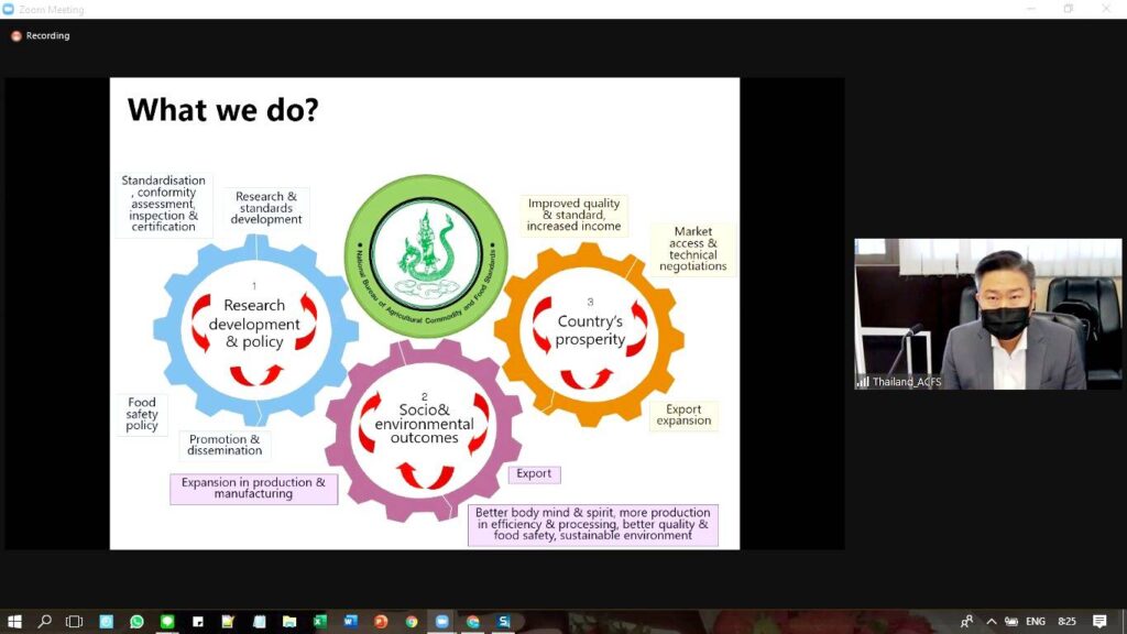 นายพิศาล พงศาพิชณ์ เลขาธิการสำนักงานมาตรฐานสินค้าเกษตรและอาหารแห่งชาติ (มกอช.) เป็นประธานการประชุมทางวิชาการร่วมกับสำนักงานแห่งชาติด้านสุขอนามัยความปลอดภัยและคุณภาพของการเกษตรและอาหารของเม็กซิโก (SENASICA) ซึ่งจัดขึ้นระหว่างวันที่ 13 – 14 กันยายน 2564 ณ ห้องประชุม 111 อาคาร 1 สำนักงานมาตรฐานสินค้าเกษตรและอาหารแห่งชาติ (มกอช.) ในรูปแบบออนไลน์ผ่านระบบ Application Zoomการประชุมดังกล่าว จัดขึ้นเพื่อแลกเปลี่ยนข้อมูลกฎระเบียบการนำเข้าสินค้าเกษตรและอาหารระหว่างกัน และเสริมสร้างความร่วมมือด้านคุณภาพและความปลอดภัยสินค้าเกษตรและอาหารของไทยและเม็กซิโก