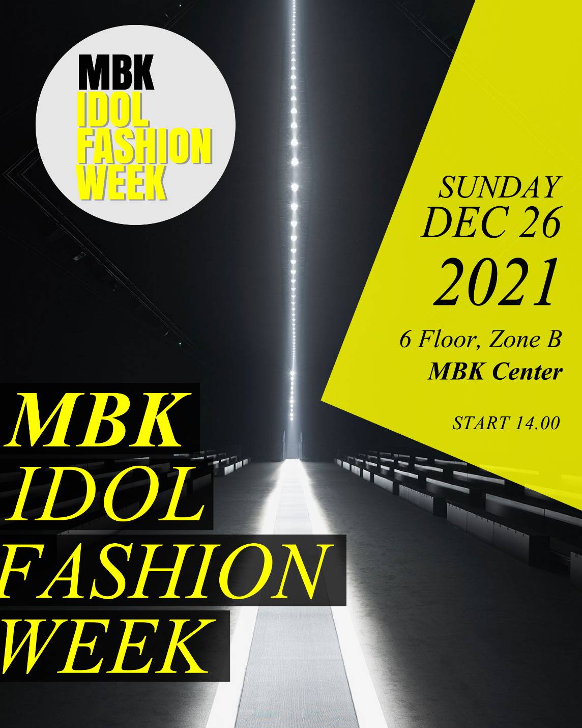 ศูนย์การค้า MBK Center จับมือกับ Idol Exchange และ Star Hunter Entertainment ร่วมสร้างปรากฏการณ์แฟชั่นโชว์ IDOL ครั้งแรกของเมืองไทย!!! ใน อาทิตย์ที่ 26 ธันวาคมนี้ ที่ MBK Center กับ MBK IDOL Fashion Week พบกับ Fashion Show Set ใหญ่ ที่ไม่เคยเห็นที่ไหนมาก่อน กับ 2 รอบโชว์ บน Runway สุดปัง กับ นายแบบ นางแบบ รวมกว่า 70 ชีวิต ปักหมุดโชว์