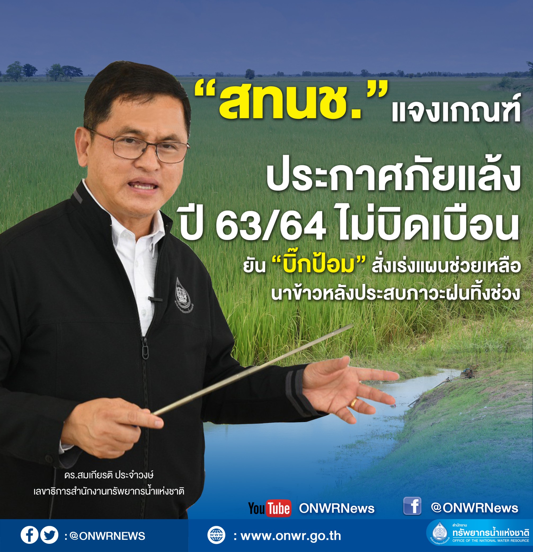 สทนช.ยืนยันฤดูแล้ง 2563/64 ที่ผ่านมา รัฐบาลวางมาตรการและแผนเชิงรุกรับมือภัยแล้งประสบผลสำเร็จ ชี้นิยามการประกาศพื้นที่ภัยแล้งตามหลักเกณฑ์ภัยพิบัติ ส่วนปัญหาข้าวนาปีขาดน้ำในปัจจุบัน เนื่องจากเกิดภาวะฝนทิ้งช่วง “บิ๊กป้อม” สั่งบูรณาการเร่งให้ความช่วยเหลือ มั่นใจสถานการณ์จะคลี่คลาย