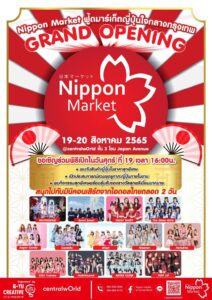 ทั้งนี้ NIPPON MARKET จะมีการจัดงานเปิดตัวอย่างเป็นทางการระหว่างวันศุกร์ที่ 19 สิงหาคม 2565 – วันเสาร์ ที่ 20 สิงหาคม 2565 ตั้งแต่เวลา 11.00 น. – 21.00 น. โดยภายในงานจะมีการจัดกิจกรรมพิธีเปิดงานอย่างเป็นทางการและการแสดงของเหล่าไอดอลและมีการเรียนเชิญแขกผู้มีเกียรติ อาทิเช่น สถานทูตญี่ปุ่นประจำประเทศไทย / สมาคมการค้าญี่ปุ่นต่างๆ มาร่วมเป็นสักขีพยานในงานดังกล่าว