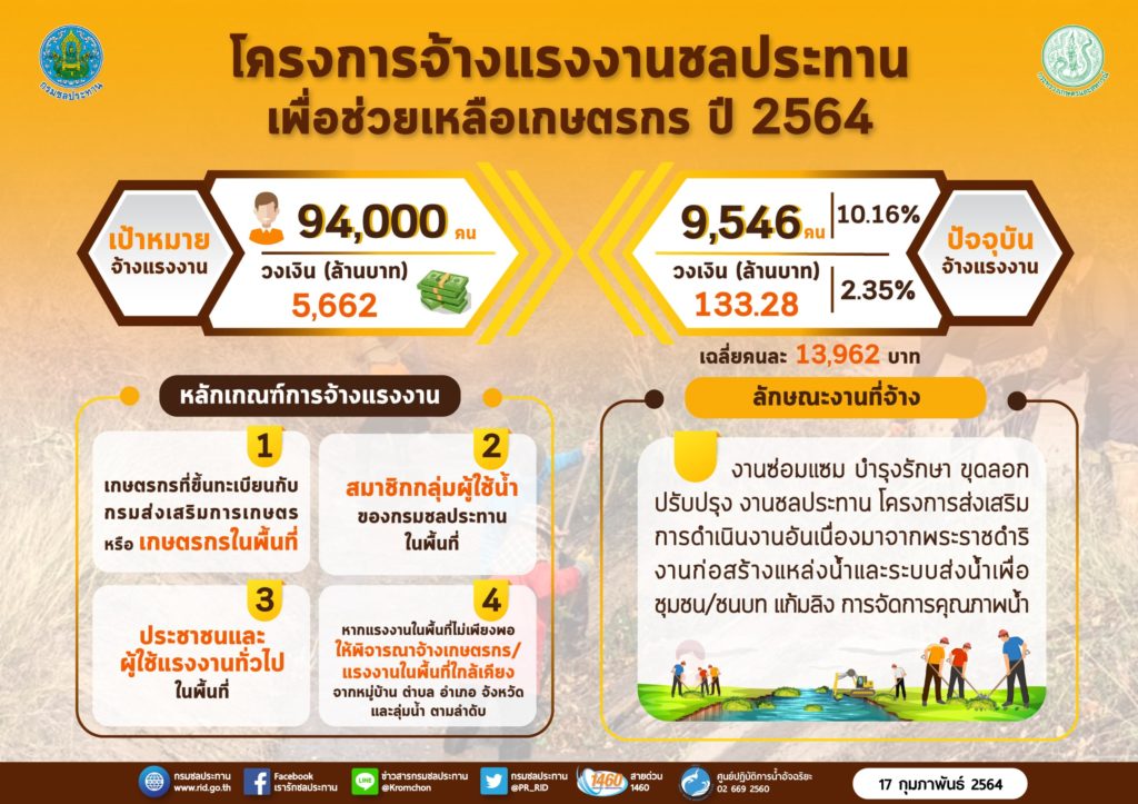 คืบหน้าโครงการจ้างแรงงานชลประทานทั้งประเทศ จ้างแล้วเกือบ 10,000 คน คิดเป็น 10% ของแผน เชิญชวนเกษตรกรและผู้สนใจในพื้นที่ เข้าร่วมโครงการฯ หวังสร้างรายได้ทดแทน และบรรเทาความเดือดร้อนให้แก่เกษตรกรและประชาชน