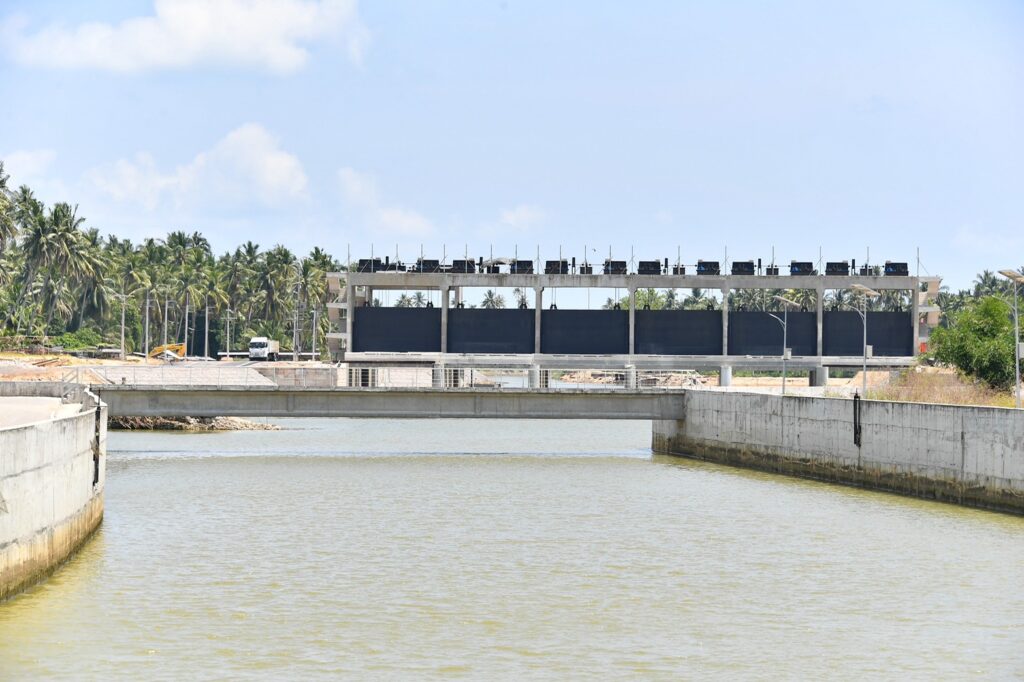 ช่วงกลางน้ำ ก่อสร้างอาคารบังคับน้ำเพื่อทำหน้าที่ควบคุมปริมาณน้ำ และบริหารจัดการน้ำ จำนวน 4 แห่ง อยู่ระหว่างดำเนินการ จำนวน 1 แห่ง ได้แก่ ประตูระบายน้ำ(ปตร.)ทุ่งพร้าว แผนงานก่อสร้างปี พ.ศ.2565-2567 ระบายน้ำได้สูงสุด 725 ลบ.ม./วินาที ผลการดำเนินงาน 0.06% และอยู่ระหว่างเตรียมความพร้อม จำนวน 3 แห่ง ได้แก่ ปตร.กลางคลองบางสะพาน ปตร.คลองปัตตามัง และ ปตร.คลอง วังกระจอง