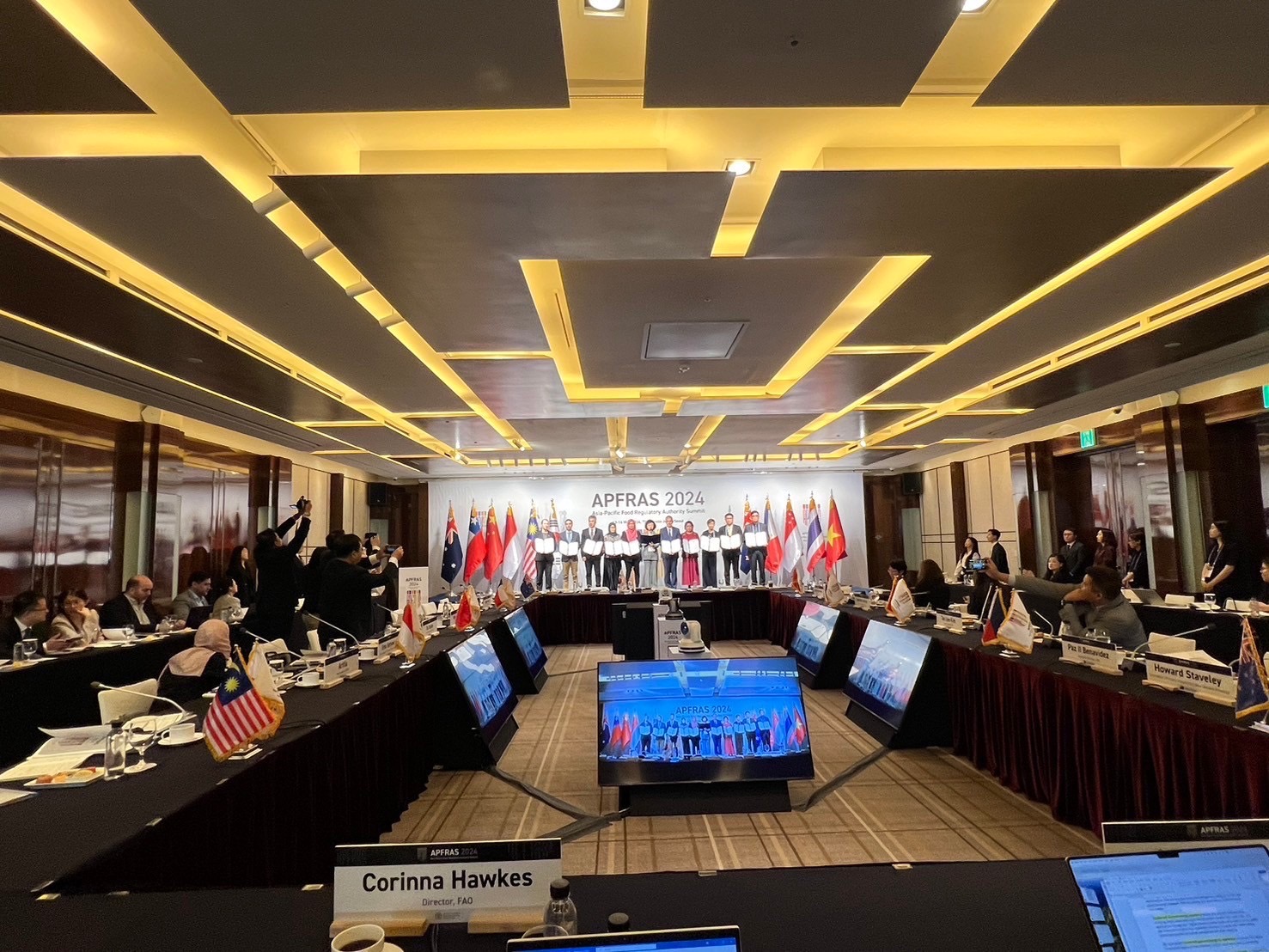 นอกจากนี้ ที่ประชุมยังได้มีการหารือเกี่ยวกับผลการดำเนินการของ APFRAS ในปีที่ผ่านมา และแผนการดำเนินงานต่อไป โดยภารกิจสำคัญในช่วงแรก APFRAS มีแผนจะเปิดตัวฐานข้อมูลกฎระเบียบที่เกี่ยวข้องกับอาหาร (APFRAS Food Regulation Database)ให้ภาคอุตสาหกรรมและประชาชนที่สนใจได้ใช้อย่างเป็นทางการในเดือนธันวาคม 2567 เพื่ออำนวยสะดวกทางการค้า นอกจากนี้ ที่ประชุมรับทราบผลการดำเนินงานของคณะทำงาน 3 คณะภายใต้ APFRAS ได้แก่ คณะทำงานด้านกฎระเบียบอาหาร ได้จัดทำรายงานการศึกษาสภาวะแวดล้อมของกฎระเบียบอาหาร (Food Regulatory Environment Analysis) ประจำปี 2566 ซึ่งรวบรวมผลการศึกษาเกี่ยวกับกระแสการเปลี่ยนแปลงที่สำคัญ อาทิ ความเป็นกลางทางคาร์บอน (Carbon Neutrality) หลักสุขภาพหนึ่งเดียง (One-Health Approach) คณะทำงานด้านดิจิตอล ที่ได้จัดสัมนาแลกเปลี่ยนประสบการณ์และองค์ความรู้เชิงลึกในการใช้เทคโนโลยีดิจิทัลเพื่อความปลอดภัยอาหารร่วมกัน และคณะทำงานด้านสิ่งแวดล้อมและเทคโนโลยีใหม่ ได้มีการจัดการประชุมโต๊ะกลมและสัมมนา ด้านอาหารที่ได้จากการเพาะเลี้ยงเซล (Cell-based food) การใช้ภาชนะจากวัตถุดิบรีไซเคิล และการประเมินความเสี่ยงภาชนะและอุปกรณ์อาหารที่เป็นมิตรต่อสิ่งแวดล้อม และมีแผน จะขยายขอบเขตไปยังกลุ่มโปรตีนทางเลือกจากแมลง