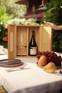 – ชุดกล่องสีส้มพร้อมแก้วไวน์ไฮบริด 2 ใบ (11,850 บาท รวม VAT) มาในสีโทนอุ่นที่ช่วยสร้างบรรยากาศผ่อนคลายเป็นกันเอง