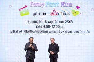 กรุงเทพฯ — สมาคมนิสิตเก่าจุฬาลงกรณ์มหาวิทยาลัยในพระบรมราชูปถัมภ์ (สนจ.) โดย ดร.ณัฐพล รังสิตพล นายกสมาคม เปิด Hall of INTANIA คณะวิศวกรรมศาสตร์ จุฬาลงกรณ์มหาวิทยาลัย จัดงาน “SWAY FIRST RUN ดูด้วยกัน สั่นกว่าใคร” ให้แฟน ๆ กว่า 400 คน ได้ชมซีรีส์แนวใหม่ “SWAY THE SERIES เพราะเธอใช่ไหม…ที่ทำให้ใจฉันสั่น” EP. แรกด้วยกัน โดยเหล่านักแสดงหน้าใหม่ยังได้เสิร์ฟโชว์สุดพิเศษทั้งการแสดงธง Chula Colorguard ใน “เพลงขวัญใจจุฬา” เวอร์ชั่นใหม่ เปิดตัวเพลงประกอบซีรีส์ “เธออีกแล้ว” โดย เคที่ แม็คเอ็นที พร้อมชวนเป็นส่วนหนึ่งของกิจกรรมปิยมหาราชานุสรณ์ ๒๕๖๘ : จุฬาลงกรณ์ แรงบันดาลใจของแผ่นดิน ร่วมบริจาคสมทบทุนจุฬาสงเคราะห์และทุนอาหารกลางวันและสนับสนุนกิจกรรมเพื่อสังคมของ สนจ. ต่อไป