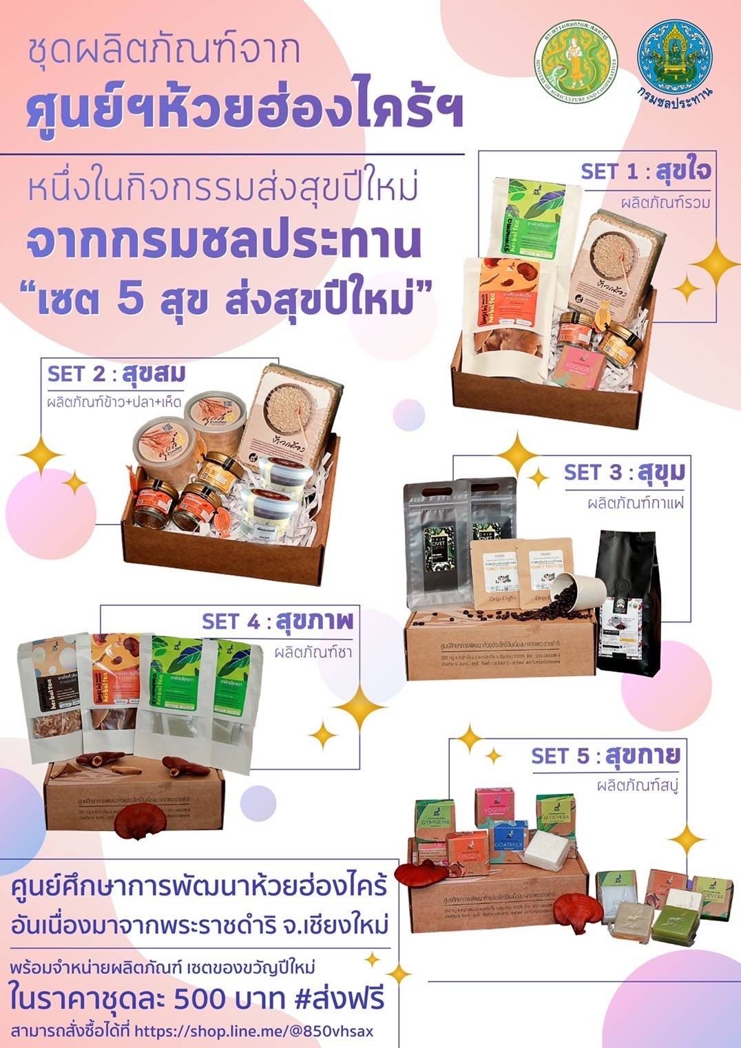นอกจากนี้ ศูนย์ศึกษาการพัฒนาห้วยฮ่องไคร้ อันเนื่องมาจากพระราชดำริ ยังได้จัดชุดของขวัญ “เซต 5 สุข ส่งสุขปีใหม่” ประกอบด้วย ผลิตภัณฑ์ปลอดภัยผลิตภัณฑ์สุขภาพต่างๆจากเกษตรกร ผู้ที่สนใจสามารถเลือกซื้อเพื่อมอบเป็นของขวัญช่วงเทศกาลปีใหม่นี้ ในราคาชุดละ 500 บาท สามารถสั่งซื้อได้ผ่านทางช่องทางออนไลน์ของ Huai Hong Khrai RDSC (https://shop.line.me/@850vhsax) ส่งฟรีช่วงเทศกาลปีใหม่