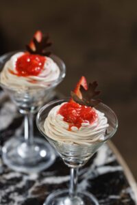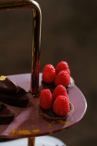 ส่วนขนมหวาน เชฟ ลอว์เรนซ์ ได้คัดสรรมาอย่างดีเพื่อยกระดับชุดน้ำชายามบ่ายชุดนี้ให้พิเศษกว่าที่เคยเป็นมาเพื่อสร้างความประทับใจให้แก่ทุก ๆ คน โดยจุดเด่นของชุดน้ำชาบ่ายชุดพิเศษนี้ ได้แก่ ทาร์ตช็อกโกแลต (Chocolate Framboise Tart) เค้กเฮเซลนัทรอยัล (Hazelnut Royale)เค้กรูบี้ช็อกโกแลตแชมเปญ (Ruby Champagne Delight) และเค้กชาแบล็กเบอร์รี่ (Blackberry Tea Cake) ส่วนช็อกโกแลตบองบองสอดไส้เกลือคาราเมลนมสดและเอิร์ลเกรย์มะพร้าว (Salted Caramel au Lait and Earl Grey Coconut) สูตรเฉพาะของเชฟ ลอว์เรนซ์นั้นเป็นช็อกโกแลตบองบองที่มีรสชาติเข้มข้นหวานมันในคำเดียวปิดท้ายชุดน้ำชายามบ่ายชุดนี้ด้วยสกอนรับประทานกับแยมสตอร์เบอร์รี่ แยมส้ม และคล็อตเตดครีม (Baked scones, served with homemade strawberry and orange preserves and clotted cream) เพื่อเติมเต็มประสบการณ์การรับประทานชุดน้ำชายามบ่าย