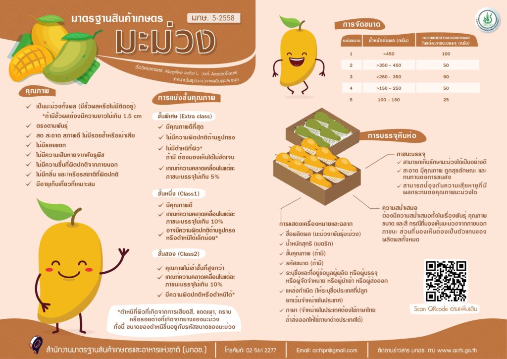 นายพิศาล พงศาพิชณ์ เลขาธิการสำนักงานมาตรฐานสินค้าเกษตรและอาหารแห่งชาติ (มกอช.) เปิดเผยว่า มะม่วงเป็นผลไม้เศรษฐกิจที่สำคัญชนิดหนึ่งของประเทศไทย มีการปลูกแพร่หลายในทุกภูมิภาค เป็นที่นิยมจากผู้บริโภคทั้งในและต่างประเทศ ปัจจุบันประเทศไทยส่งออกมะม่วงเป็นอันดับ 2 ของอาเซียน และเป็นอันดับ 7 ของโลก โดยในปี 2564 มะม่วงผลสดและแช่เย็นจนแข็ง มีปริมาณการส่งออก 116,850 ตัน คิดเป็นมูลค่า 3,367 ล้านบาท มีการขยายตัวเพิ่มขึ้นทั้งปริมาณและมูลค่า โดยมีตลาดส่งออกที่สำคัญ ได้แก่ มาเลเซีย ฮ่องกง เวียดนาม สิงคโปร์ จีน ญี่ปุ่น เกาหลีใต้ รัสเซีย และยุโรป โดยพันธุ์ที่นิยมสำหรับการค้าและส่งออก ได้แก่ มะม่วงน้ำดอกไม้สีทอง มะม่วงมันขายตึก มะม่วงเขียวเสวย มะม่วงมหาชนก มะม่วงโชคอนันต์ มะม่วงฟ้าลั่น และมะม่วงทวายเดือนเก้า โดยมีพื้นที่การผลิตมะม่วงประมาณ 2 ล้านไร่ ผลิตมากที่จังหวัดเชียงใหม่ เลย สุโขทัย พิจิตร ประจวบคีรีขันธ์ สุพรรณบุรี ฉะเชิงเทรา เพชรบุรี และพิษณุโลก ซึ่งตลาดการส่งออกมะม่วงของประเทศไทยมีแนวโน้มเติบโตขึ้น จากการเจรจาเปิดตลาดเขตการค้าเสรี (Free Trade Area) ทำให้ปลอดการเก็บภาษีนำเข้ามะม่วงจากไทยกับประเทศคู่ค้า ประกอบกับความต้องการบริโภคมะม่วงเพิ่มขึ้นในตลาดจีนและฮ่องกง นับเป็นโอกาสของเกษตรกรผู้ปลูกมะม่วง ที่สามารถผลักดันการส่งออกได้เพิ่มขึ้น