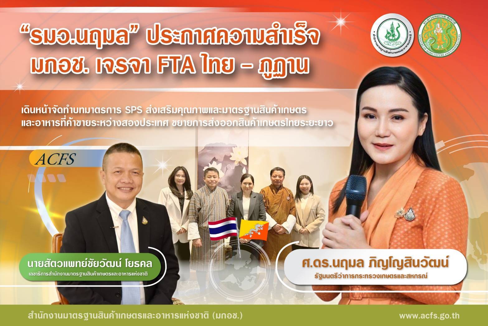 ด้านนายสัตวแพทย์ชัยวัฒน์ โยธคล เลขาธิการ มกอช. กล่าวว่า ทั้งนี้ มกอช. ได้มอบหมายให้นางสาวรวินันท์ ฉ่ำเฉลิม ผู้อำนวยการกองนโยบายและมาตรฐานสินค้าเกษตร (กนม.) เป็นหัวหน้าคณะเจรจาฝ่ายไทย พร้อมด้วยผู้แทนกลุ่มนโยบายระหว่างประเทศที่ 1 เข้าร่วมการประชุมคณะทำงานด้านมาตรการสุขอนามัยและสุขอนามัยพืช (Working Group on SPS) เพื่อเจรจาจัดทำบท SPS ภายใต้การเจรจาจัดทำ FTA ไทย- ภูฏาน ครั้งที่ 3 ณ เมืองพาโร ราชอาณาจักรภูฏาน ซึ่งการเจรจาครั้งนี้ บรรลุผลตามเป้าหมายที่วางไว้ โดยทั้งสองฝ่ายได้ข้อสรุปร่วมกันในทุกข้อบท พร้อมทั้งเห็นชอบร่วมกันที่จะจัดตั้งคณะอนุกรรมการว่า ด้วยมาตรการด้านสุขอนามัยและสุขอนามัยพืช เพื่อเป็นกลไกในการจัดการกับปัญหาและเสริมสร้างความร่วมมือทางวิชาการระหว่างกัน ซึ่งภูฐานยังคงต้องการความร่วมมือทางวิชาการกับไทยเพื่อเสริมสร้างศักยภาพในด้านการควบคุมกำกับดูแลความปลอดภัยของสินค้าเกษตรและอาหาร