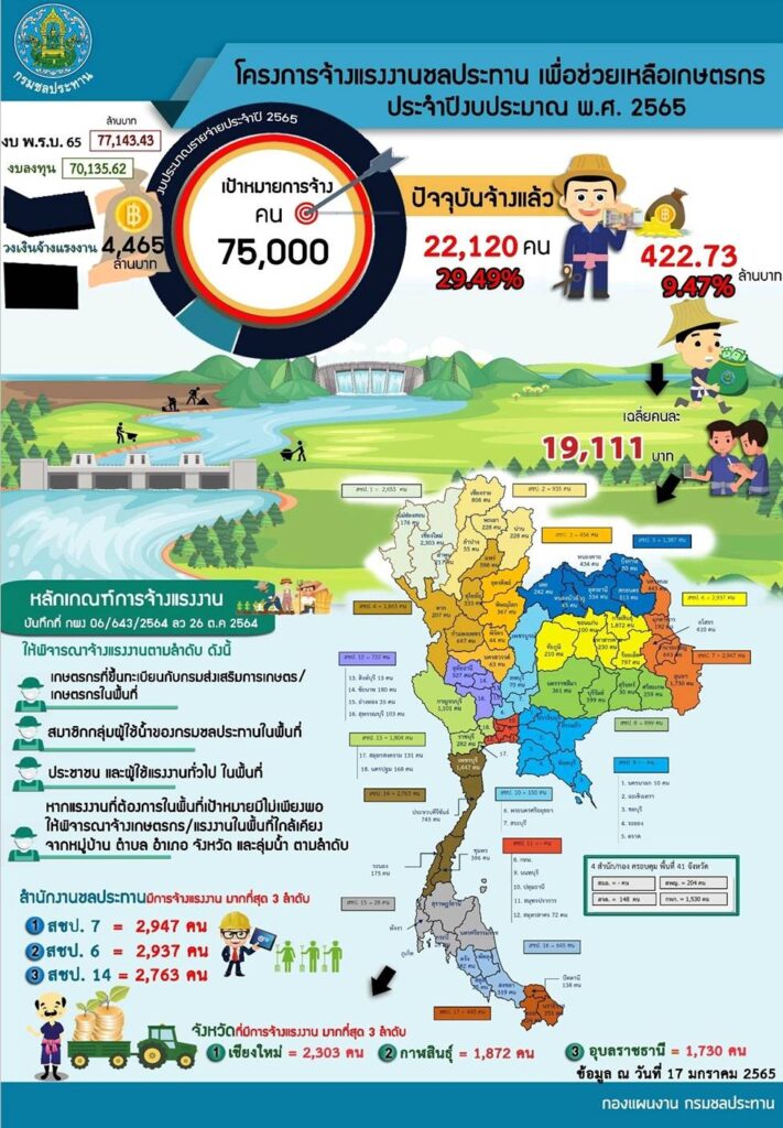 นายประพิศ จันทร์มา อธิบดีกรมชลประทาน เปิดเผยว่า กรมชลประทาน ได้ขานรับนโยบายของรัฐมนตรีว่าการกระทรวงเกษตรและสหกรณ์ ด้วยการดำเนินโครงการจ้างแรงงานชลประทาน เพื่อช่วยเหลือเกษตรกร ประจำปีงบประมาณ พ.ศ. 2565 เพื่อซ่อมแซม บำรุงรักษา ขุดลอก ปรับปรุงงานชลประทาน โครงการส่งเสริมการดำเนินงานอันเนื่องมาจากพระราชดำริ ก่อสร้างแหล่งน้ำ และระบบส่งน้ำเพื่อชุมชน/ชนบท แก้มลิง การจัดการคุณภาพน้ำ และโครงการป้องกันและบรรเทาภัยจากน้ำ ด้วยการจัดจ้างแรงงานทั่วทุกภาคของประเทศ ซึ่งในปีงบประมาณ พ.ศ. 2565 มีแผนจัดจ้างแรงงานทั้งสิ้น 75,000 คน วงเงินงบประมาณ 4,465 ล้านบาท ระยะเวลาการจ้างแรงงานอยู่ระหว่าง 1 – 10 เดือน วงเงินจ้างแรงงาน/คน จะอยู่ที่ประมาณ 8,700 – 87,000 บาท ปัจจุบันมีการจ้างแรงงานแล้ว 22,120 คน จังหวัดที่มีผลการจ้างแรงงานมากที่สุด 3 ลำดับ คือ 1. จังหวัดเชียงใหม่ 2,303 คน 2. จังหวัดกาฬสินธุ์ 1,872 คน และ 3.จังหวัดเพชรบุรี 1,730 คน