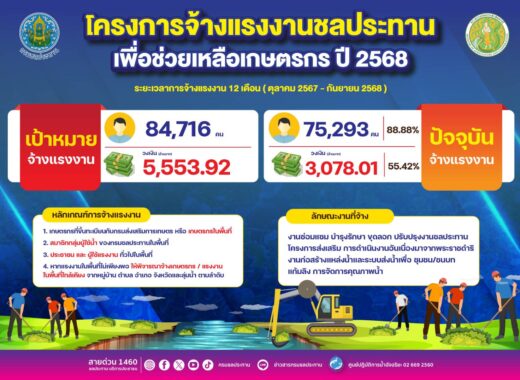 สำหรับโครงการจ้างแรงงานชลประทาน ได้ดำเนินการมาอย่างต่อเนื่อง เพื่อช่วยเหลือและบรรเทาความเดือดร้อนให้กับเกษตรกร ที่ได้รับผลกระทบจากภัยแล้ง จึงขอเชิญชวนให้พี่น้องเกษตรกร และประชาชนทั่วไป เข้าร่วมโครงการฯ เพื่อเป็นการสร้างรายได้เสริมหรือทดแทนจากการสูญเสียรายได้ด้านการเกษตร หากเกษตรกรหรือประชาชนที่สนใจเข้าร่วมโครงการฯ สามารถติดต่อสอบถามหรือสมัครได้ที่โครงการชลประทานใกล้บ้าน หรือทางสายด่วนกรมชลประทาน 1460 ชลประทานบริการประชาชน