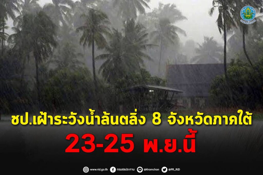 นายประพิศ จันทร์มา อธิบดีกรมชลประทาน เปิดเผยว่า ศูนย์บริหารจัดการน้ำส่วนหน้าในพื้นที่ภาคใต้ กองอำนวยการน้ำแห่งชาติ ได้ประเมินและวิเคราะห์สถานการณ์น้ำจากฝนคาดการณ์ (ONE MAP) ของกรมอุตุนิยมวิทยาและสถาบันสารสนเทศทรัพยากรน้ำ (องค์การมหาชน) และข้อมูลฝนที่ตกลงมาในพื้นที่ รวมทั้งพื้นที่เคยเกิดน้ำหลากและน้ำล้นตลิ่งในช่วงที่ผ่านมา พบว่ามีพื้นที่เสี่ยงเฝ้าระวังน้ำหลาก ดินถล่ม ในช่วงวันที่ 23 – 25 พฤศจิกายน 2564 บริเวณจังหวัดประจวบคีรีขันธ์ ชุมพร สุราษฎร์ธานี นครศรีธรรมราช พัทลุง สงขลา ระนอง ตรัง และสตูล พร้อมกับเฝ้าระวังอ่างเก็บน้ำขนาดกลางที่มีปริมาณน้ำมากกว่าร้อยละ 80 และมีแนวโน้มเพิ่มสูงขึ้น เสี่ยงน้ำล้นกระทบพื้นที่บริเวณท้ายอ่างเก็บน้ำในภาคใต้ บริเวณจังหวัดประจวบคีรีขันธ์ ชุมพร สุราษฎร์ธานี กระบี่ ระนอง ภูเก็ต และตรัง