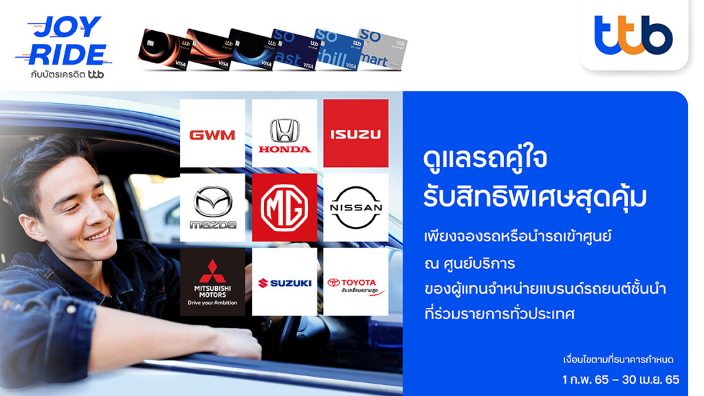บัตรเครดิต ทีทีบี ชวนดูแลรถคู่ใจ และมอบความคุ้มค่าให้กับลูกค้าบัตรเครดิต ทีทีบี ที่จองรถหรือนำรถเข้าศูนย์ ณ ศูนย์บริการของผู้แทนจำหน่ายแบรนด์รถยนต์ชั้นนำที่ร่วมรายการทั่วประเทศ ได้แก่ เกรท วอลล์ มอเตอร์ ฮอนด้า อีซูซุ มาสด้า เอ็มจี มิตซูบิชิ นิสสัน ซูซุกิ และ โตโยต้า โดยจัดเต็ม 2 สิทธิพิเศษสุดคุ้ม ได้แก่ รับเครดิตเงินคืนสูงสุด 10,000 บาท และแลกรับเครดิตเงินคืนสูงสุด 15% ตั้งแต่วันนี้ ถึง 30 เมษายน 2565