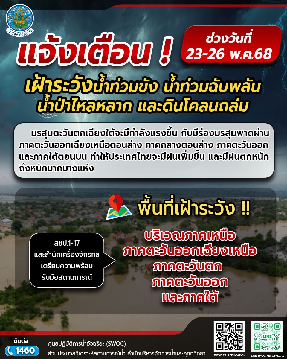 ศูนย์ปฏิบัติการน้ำอัจฉริยะ (SWOC) กรมชลประทาน เปิดเผยหลังสำนักงานทรัพยากรน้ำแห่งชาติ (สทนช.) ออกประกาศเตือนเฝ้าระวังสถานการณ์น้ำท่วมขัง น้ำท่วมฉับพลัน น้ำป่าไหลหลาก และดินโคลนถล่ม ระหว่างวันที่ […]…