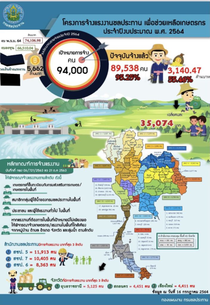 นายประพิศ จันทร์มา อธิบดีกรมชลประทาน เปิดเผยถึงความก้าวหน้าโครงการจ้างแรงงานชลประทาน เพื่อช่วยเหลือเกษตรกรและประชาชนที่ได้รับผลกระทบจากภัยแล้งและโรคระบาดโควิด 19 ว่า กรมชลประทาน ได้ดำเนินการตามนโยบายรัฐบาล ในการช่วยเหลือของกระทรวงเกษตรและสหกรณ์ ด้วยการดำเนินโครงการจ้างแรงงาน ในปีงบประมาณ 2564 สำหรับงานซ่อมแซม บำรุงรักษา ขุดลอก ปรับปรุงงานชลประทาน โครงการส่งเสริมการดำเนินงานอันเนื่องมาจากพระราชดำริ ก่อสร้างแหล่งน้ำระบบส่งน้ำเพื่อชุมชน แก้มลิง การจัดการคุณภาพน้ำและโครงการป้องกันและบรรเทาภัยจากน้ำ โดยมีแผนจ้างแรงงานทั่วประเทศในปีงบประมาณ 2564 จำนวน 5,662 ล้านบาท สามารถจ้างแรงงานได้ทั้งสิ้น 94,000 คน ระยะเวลาการจ้างอยู่ระหว่าง 3 – 8 เดือน วงเงินจ้างแรงงานอยู่ระหว่าง 22,000 – 60,000 บาท/คน ปัจจุบัน (ข้อมูล ณ วันที่ 16 กรกฎาคม 64) มีการจ้างแรงงานทั่วประเทศภายใต้มาตรการป้องกันและควบคุมโรคติดต่อ ของศูนย์บริหารสถานการณ์แพร่ระบาดของโรคติดเชื้อไวรัสโคโรน่า 2019 ไปแล้วกว่า 89,538 คน หรือคิดเป็นร้อยละ 95 ของแผนฯ จังหวัดที่มีผลการจ้างแรงงานมากที่สุด 3 ลำดับ ได้แก่ จังหวัดอุบลราชธานี 5,125 คน จังหวัดสกลนคร 4,451 คน จังหวัดเชียงใหม่ 4,411 คน