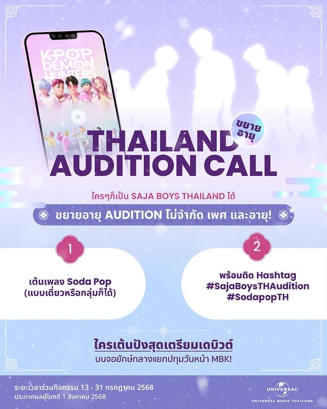 ไม่ต้องรอถึง 400 ปีเหมือนในหนัง ก็เดบิวต์เป็นสมาชิกวง Saja Boysได้! ขอเพียงเป็นคนไทยหัวใจ Soda Pop และ KPop Demon Huntersไม่จำกัดเพศ อายุ และจำนวนสมาชิก มีสิทธิ์ลุ้นได้เป็นผู้ชนะ เดบิวต์เป็นสมาชิก Saja Boys Thailand บนจอยักษ์กลางสี่แยกปทุมวันหน้าห้างสรรพสินค้า MBK สุดฮิตกันไปเลยยกแก๊ง! เพียงทำตามกติกาง่าย ๆ ดังนี้