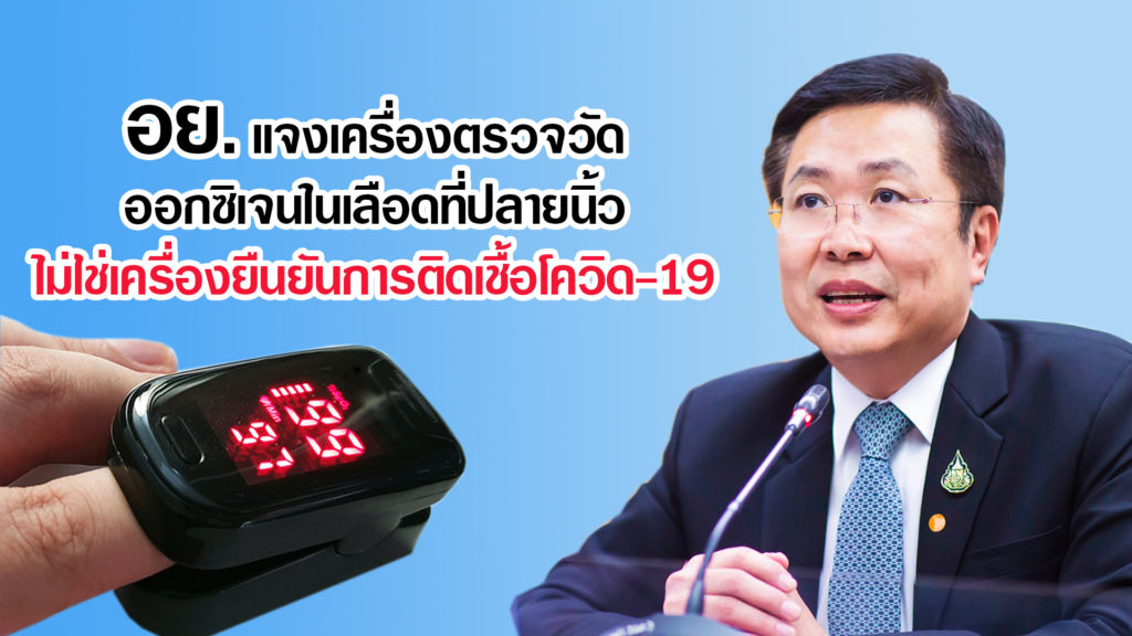 นายแพทย์สุรโชค ต่างวิวัฒน์ รองเลขาธิการคณะกรรมการอาหารและยา เปิดเผยว่า จากกรณีที่มีสื่อ ต่าง ๆ โฆษณาแนะนำให้ประชาชนหาซื้อเครื่องตรวจวัดระดับออกซิเจนในเลือดที่ปลายนิ้ว มาไว้ติดบ้านเพื่อวัดระดับออกซิเจนในร่างกายและตรวจสอบว่าตนเองติดเชื้อโควิด-19 หรือไม่ นั้น สำนักงานคณะกรรมการอาหารและยา (อย.) ขอเรียนว่า เครื่องตรวจวัดระดับออกซิเจนในเลือดที่ปลายนิ้วไม่ใช่เครื่องมือที่ใช้ในการวินิจฉัยยืนยันการติดเชื้อโควิด-19 แต่ใช้ตรวจวัดระดับออกซิเจนในเลือดและอัตราการเต้นของหัวใจ เพื่อประเมินสภาวะผิดปกติของร่างกายหรือติดตามอาการของผู้ป่วย