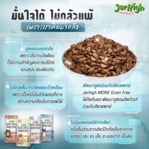 จุดเด่นของ Jerhigh More Grain-Free คือ ลดความเสี่ยงอาการแพ้และช่วยส่งเสริมสุขภาพของสุนัข บริษัทฯ นำผลิตภัณฑ์ไปทดสอบกับสุนัขพันธุ์เล็กจากฟาร์มอายุ 1-4 ปี เป็นเวลาติดต่อกัน 14 วัน ผลลัพธ์ที่ได้ ขนสวย สุขภาพดีขึ้น 90%, คราบน้ำตาลดลง 80%, รูปร่างสมส่วนขึ้น 93%, ขับถ่ายเป็นก้อน กลิ่นไม่แรง 100% และที่สำคัญ รสชาติถูกปาก สุนัขชอบ 100% มาพร้อมกับความอร่อยหลากหลายรสชาติ ได้แก่ 1. สูตรไก่ 2. สูตรไก่และเนื้อ 3. สูตรไก่และตับ 4. สูตรแซลมอน ไม่มีส่วนผสมเนื้อไก่ เหมาะสำหรับสุนัขที่แพ้ไก่ สามารถติดตามรายละเอียดเพิ่มเติมหรือสั่งซื้อได้ที่ Facebook Fanpage : jerhighofficial , Line My Shop : @jerhighfordog หรือ http://www.jerhigh.com/