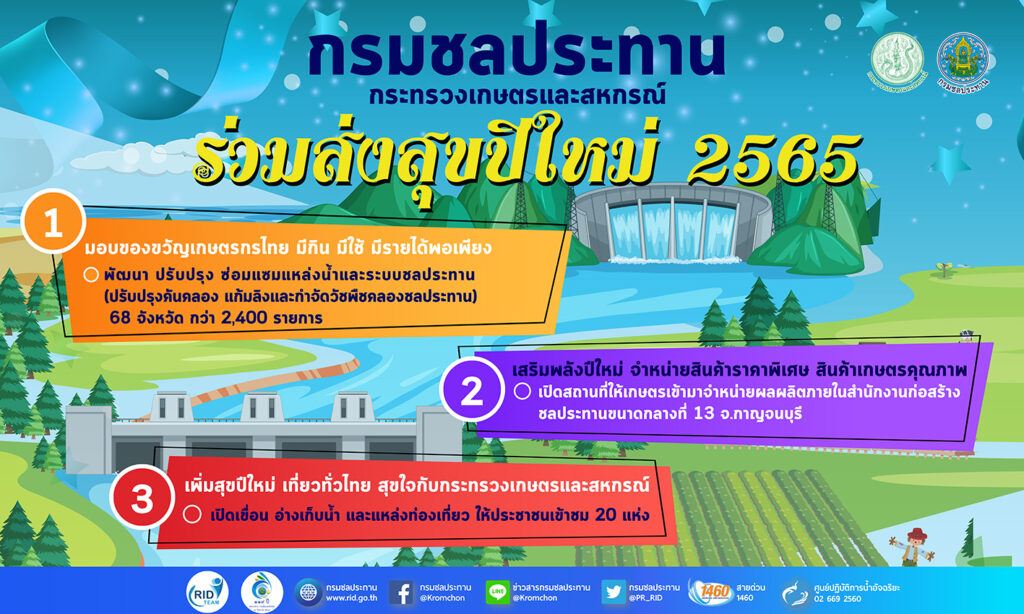 ในการนี้ กรมชลประทาน ขอเชิญชวนให้พี่น้องประชาชน รวมทั้งนักท่องเที่ยว ที่เดินทางกลับภูมิลำเนาหรือท่องเที่ยวไปยังสถานที่ต่างๆ ทั่วประเทศ ในช่วงเทศกาลปีใหม่ 2565 แวะพักผ่อนตามสถานที่ต่างๆ ไม่ว่าจะเป็น อ่างเก็บน้ำ เขื่อนทดน้ำ หรือแหล่งน้ำต่างๆ ของกรมชลประทานที่เปิดให้บริการทั่วประเทศ ท้ายที่สุดนี้ กรมชลประทาน ขอให้นักท่องเที่ยวและประชาชนทุกท่าน เดินทางท่องเที่ยวและไปกลับภูมิลำเนาโดยสวัสดิภาพ และขอความสุขสวัสดีจงมีแด่ทุกท่านในเทศกาลส่งท้ายปีเก่าต้อนรับปีใหม่ปี 2565 นี้