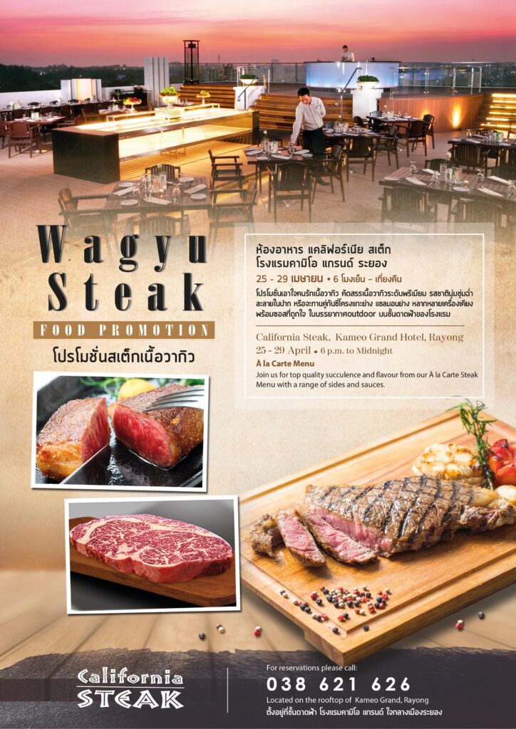 วันที่ 25- 29 เมษายน 2565 ตั้งแต่เวลา 18.00-24.00 น. ห้องอาหารแคลิฟอร์เนีย สเต็ก โรงแรมคามิโอ แกรนด์ ระยอง ขอเชิญชวนสเต๊กเลิฟเวอร์ทุกท่านมาลิ้มลองความอร่อยของสเต๊กเนื้อวากิวระดับพรีเมียม มีกลิ่นหอมเย้ายวนใจ ให้รสสัมผัสนุ่มละมุนลิ้นละลายในปาก และรสชาติหวานอร่อยไม่เหมือนใคร ที่เชฟรังสรรค์เป็นเมนูเลิศรสเสิร์ฟพร้อมซอสสูตรเฉพาะที่มีให้เลือกตามความชอบอย่างซอสเห็ดและทรัฟเฟิล หรือซอสพริกไทย หรือซอสไวน์แดง หรือซอสเนยกระเทียม เลือกทานคู่กับมันบด หรือมันอบ หรือมันฝรั่งทอด อาทิ สเต๊กเนื้อสันแหลม ฮากาตะวากิว, สเต๊กเนื้อสันนอก ซากะวากิว, สเต๊กเนื้อสันใน คาโกชิม่าวากิว หรือจะลองสเต๊กเนื้อวากิว ทานคู่กับซี่โครงแกะย่าง หรือแซลมอนย่าง ก็อร่อยล้ำ