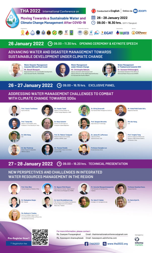 วันนี้ (26 มกราคม 2565) พลอากาศเอก ชลิต พุกผาสุข องคมนตรี เป็นประธานในพิธีเปิดการประชุมวิชาการระดับนานาชาติ THA 2022 ในหัวข้อ “การมุ่งสู่การจัดการน้ำและการเปลี่ยนแปลงสภาพภูมิอากาศอย่างยั่งยืนหลังโควิด-19” (THA 2022 International Conference on Moving Towards a Sustainable Water and Climate Change Management After COVID-19) ระหว่างวันที่ 26 – 28 มกราคม 2565 ผ่านรูปแบบออนไลน์