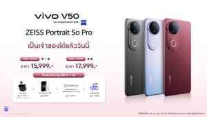 vivo V50 วางจำหน่ายในตลาดประเทศไทยอย่างเป็นทางการ พร้อมให้ผู้ที่สนใจเริ่มจับจองไป “ถ่ายที่รักอย่างโปร” ได้แล้ววันนี้ที่หน้าร้าน vivo Brand Shop ทุกสาขา ช่องทางออนไลน์ และตัวแทนจำหน่ายทั่วประเทศ ใน 2 รุ่นความจุ ได้แก่ 12GB + 256GB ในราคา 15,999 บาท และ 12GB + 512GB ในราคา 17,999 บาท พิเศษสำหรับ vivo fans ที่สั่งซื้อภายในวันที่ 26 กุมภาพันธ์ – 31 มีนาคม 2568 นี้ จะได้สิทธิ์รับของสมนาคุณมูลค่ารวมสูงสุดกว่า 11,688 บาท ประกอบด้วย